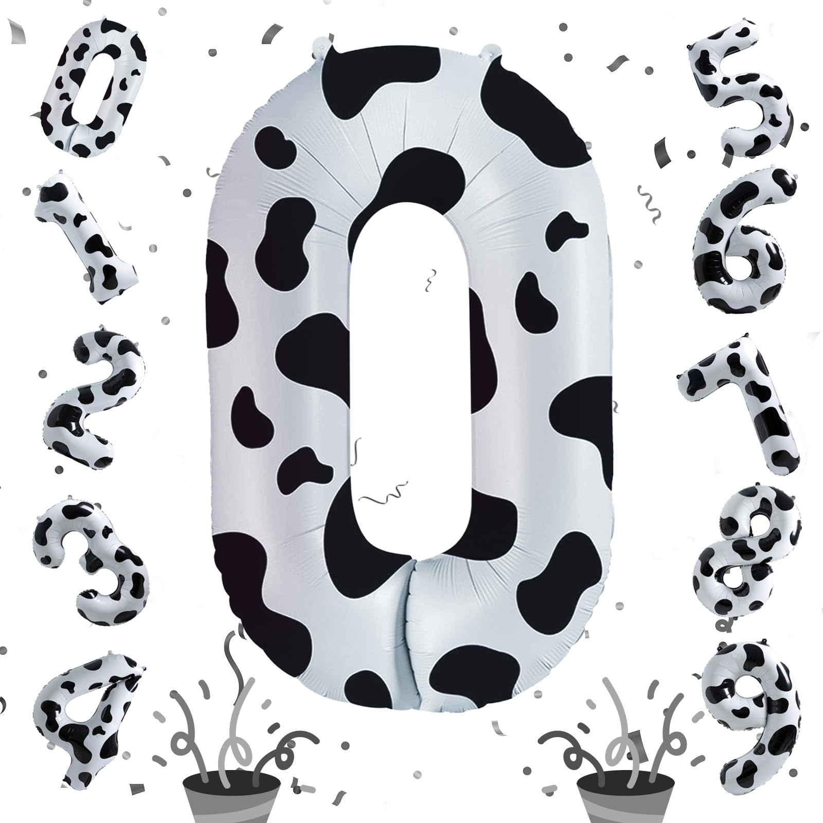 - Q: What sizes are available for the cow print number balloons? A: The cow print number balloons are available in a giant 40-inch size, making them perfect for standout birthday decorations and themed parties.