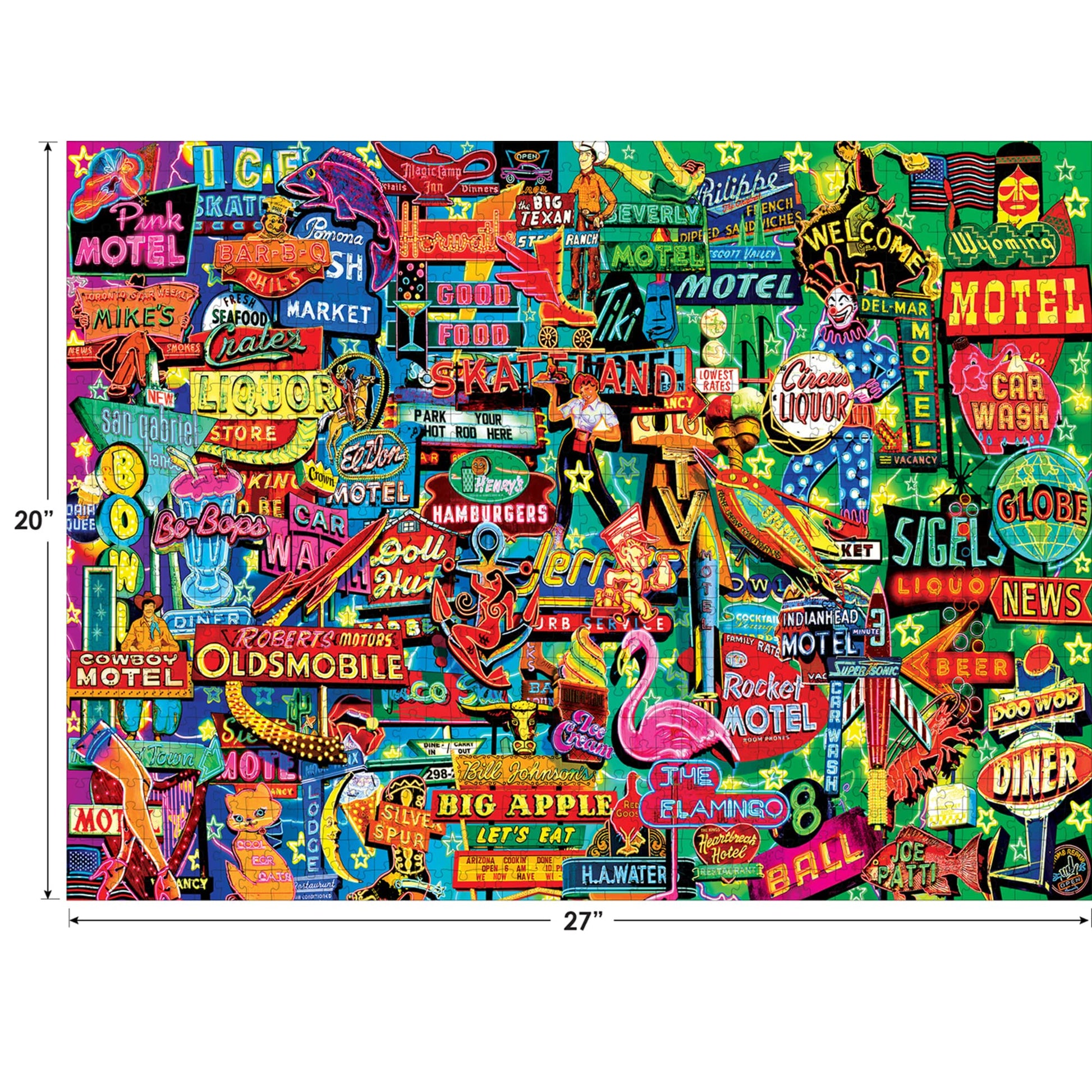 This 1000 piece Kodak Neon Retro Signs by Garry Walton puzzle by Cra-Z-Art is made on high quality blue board and features bright, sharp, colorful pictures you have come to expect from the Kodak brand. This 7.9x2.4x8 inch package contains 1,000 pieces. Finished size 20x27 inch. Made in the USA.