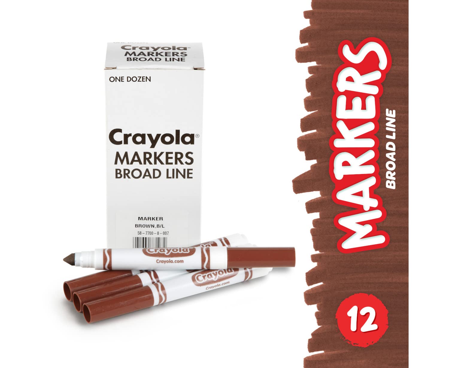 Product DescriptionOrder your favorite Classic Crayola Brown Markers in bulk! Conveniently packaged in a reusable tuck box, each set contains 12 of the same color. With its conical tip, the Crayola Broad Line Marker is a versatile drawing tool. Perfect for coloring in large areas, these markers are also great for drawing thin lines or dots. Kids can even create a ribbon effect with lines that taper from thick to thin. Broad line markers lay down plenty of color and won't smudge or bleed through paper. Great for classrooms, art studios, and more! Safe and nontoxic, ages 3 and up. Stock up on more bulk color options including Green, Blue, Violet, Red, Orange, Yellow, Brown, or Black markers.From the ManufacturerCrayola Original 12ct Markers are perfect for drawing, coloring, writing and school projects providing hours of creative fun. Economical and Convenient. Provides hours of creative coloring fun Made in America.