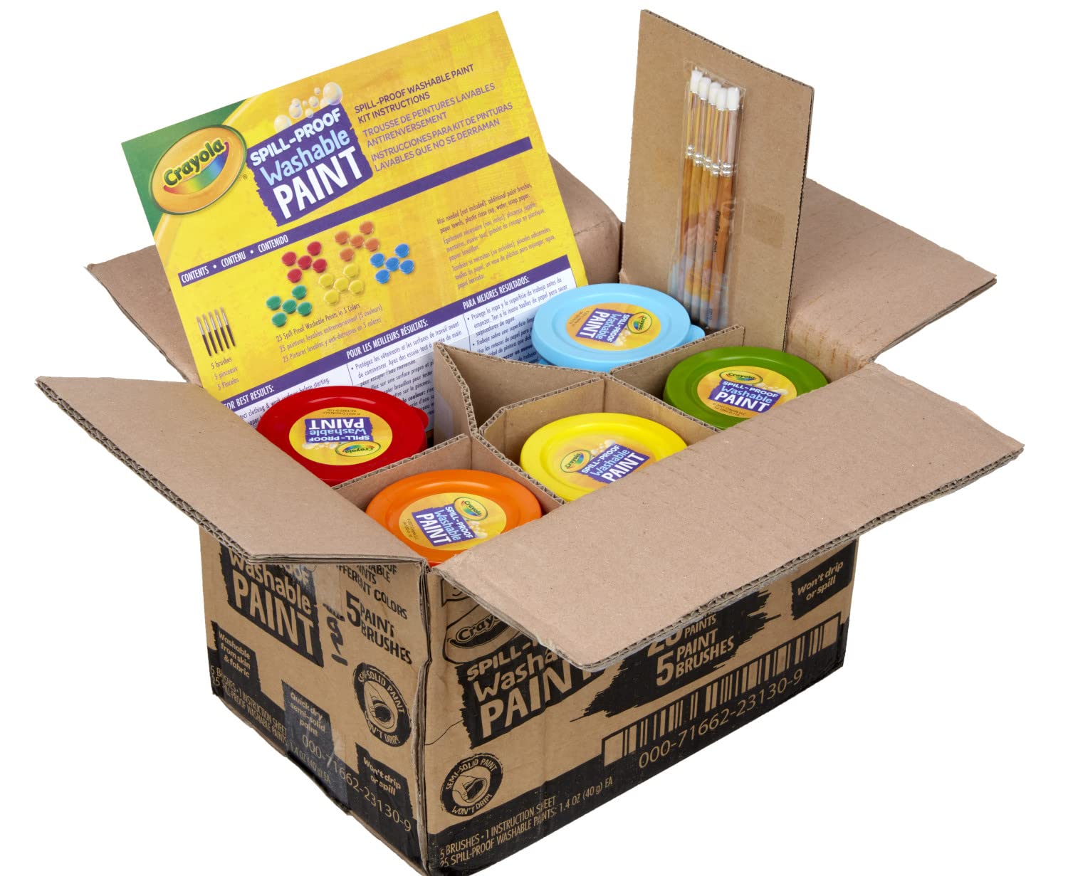 - Q: What supplies are included in the Crayola Paint Set? A: The Crayola Spill Proof Paint Set includes 25 jars of washable paint, 5 paint brushes, and an instruction guide, providing everything needed for an all-in-one painting experience.