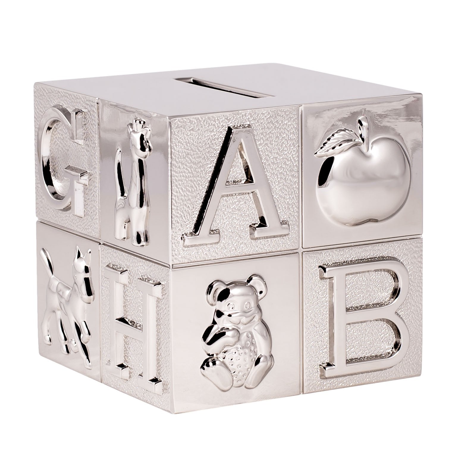 Our Abc Block Bank Is A Traditional Keepsake Gift Featuring Raised Alphabet Letters With Corresponding Animals Or Icons Letters A Thru H Are Shown On The Bank Along With The Following Animals - A - Apple, B - Bear, C - Cat, D - Duck, E - Elephant, F - Fish, G - Giraffe, H - Horse This Bank Is Produced In A Non-Tarnish Bright Nickel Plated Finish The Coin Slot Is Located On The Top Of The Bank And There Is An Engraving Area Of 125 X 3 On Each Side Of The Coin Slot Overall Dimensions Are 3 Square Silver Gift Box