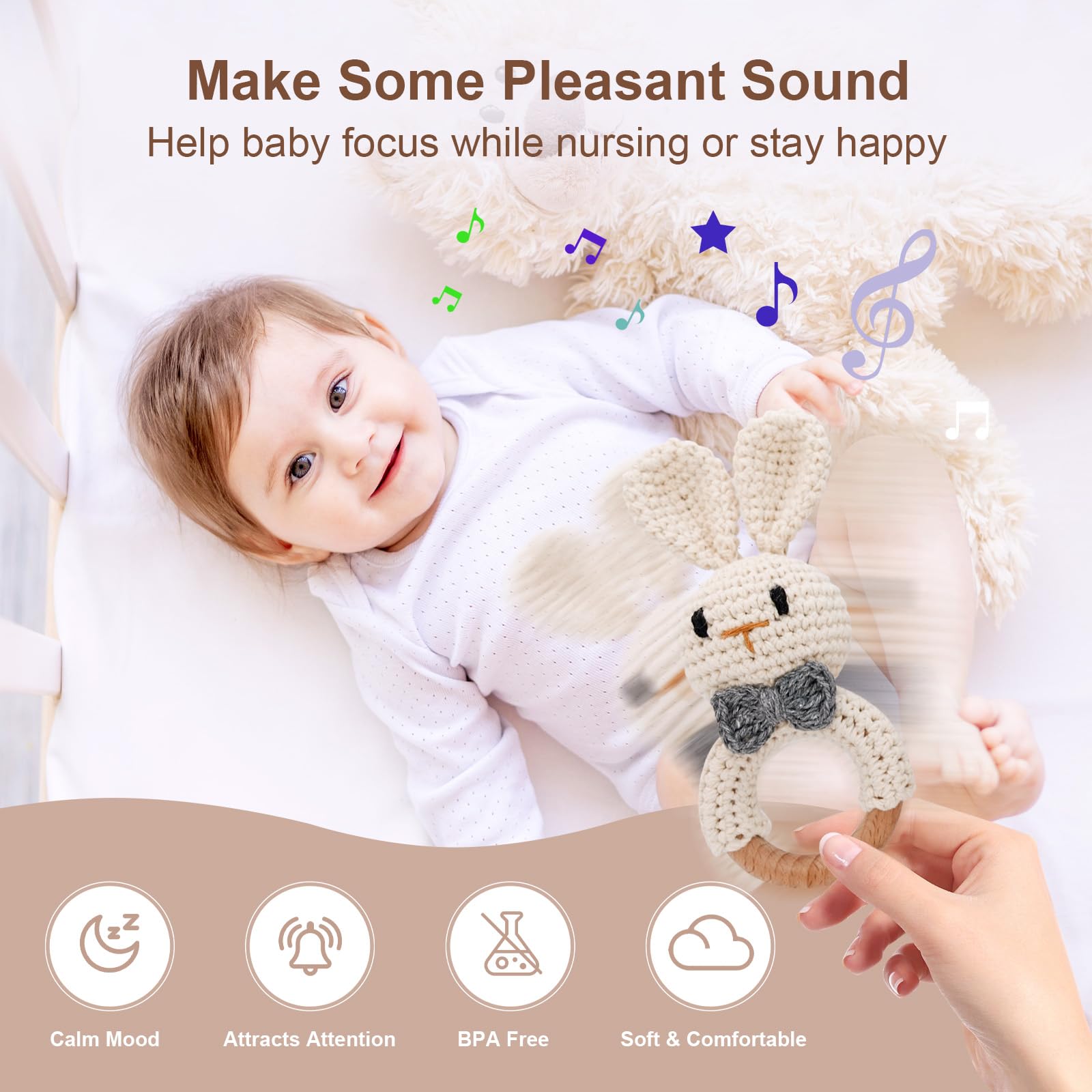 Crochet Bunny Rattle for Baby, Soft Baby Rattle Toys Wooden Ring Rattle for Toddlers Cute Rattle Toy Boy Girl First Rattle Gift Perfect Baby Shower Gift for Moms & Babies