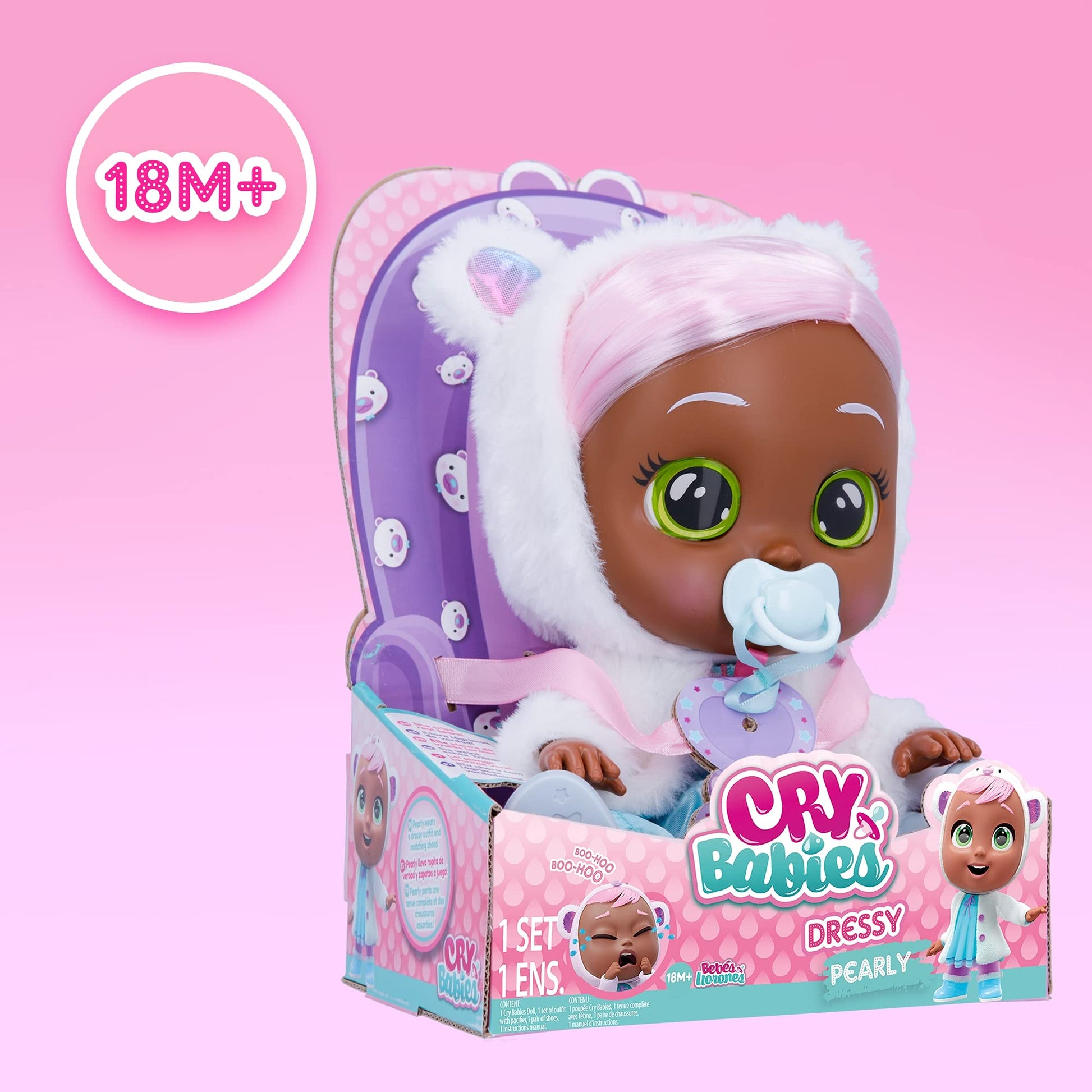 • Q: What features does the Cry Babies Dressy Pearly doll have? A: Pearly features pastel pink rooted hair, green sparkly eyes, and a cute outfit including a shiny blue dress, purple leggings, and a white fluffy jacket with animal ears. She also cries real tears and makes 10 realistic baby sounds.