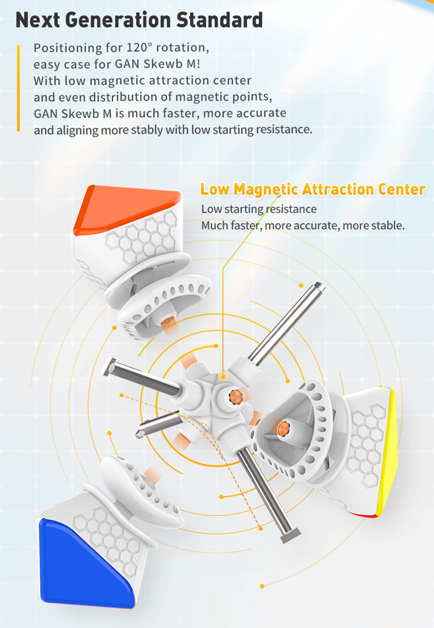 - Q: How does the magnetic core positioning enhance my cubing experience? A: The GAN Skewb features a magnetic core positioning system that provides increased stability and smoother turns. The internal magnets help align the cube during twists, allowing for faster and more precise movements.