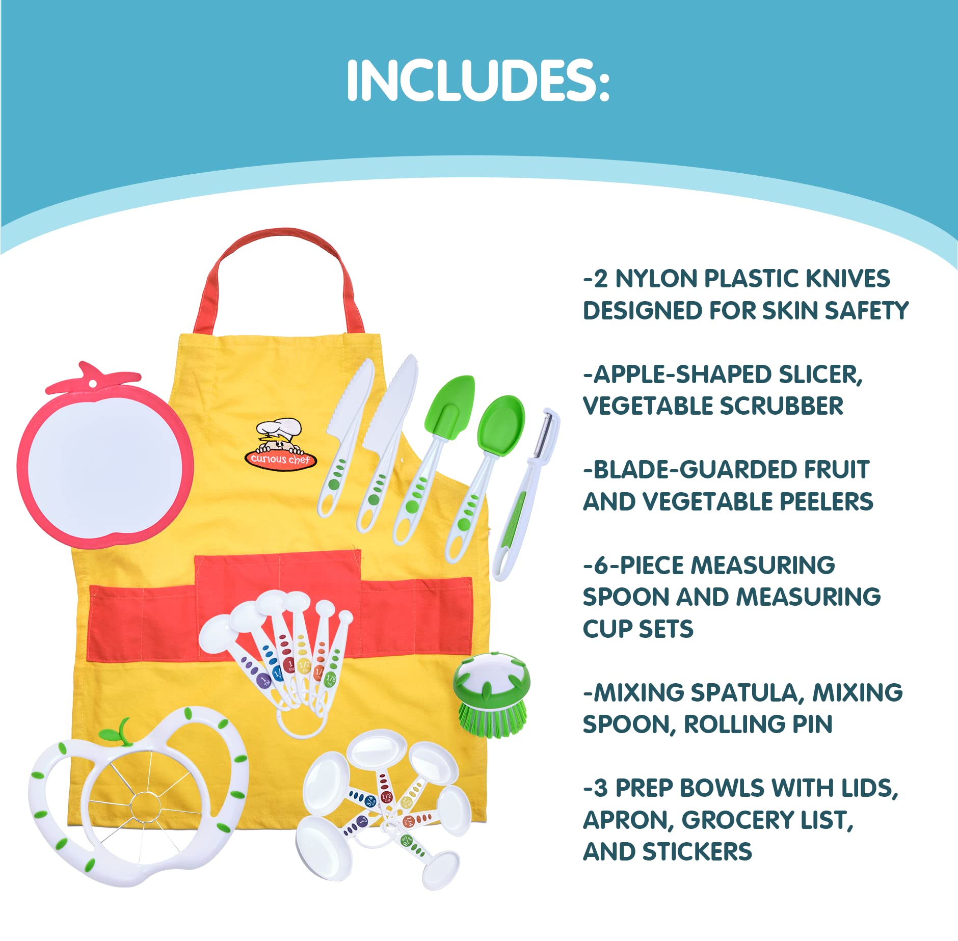 • Q: Are the tools in this kitchen set safe for kids? A: Yes, all tools in the Curious Chef Kitchen Basics Kit have been rigorously tested and approved by kids themselves, ensuring they are safe and easy to use for young chefs.