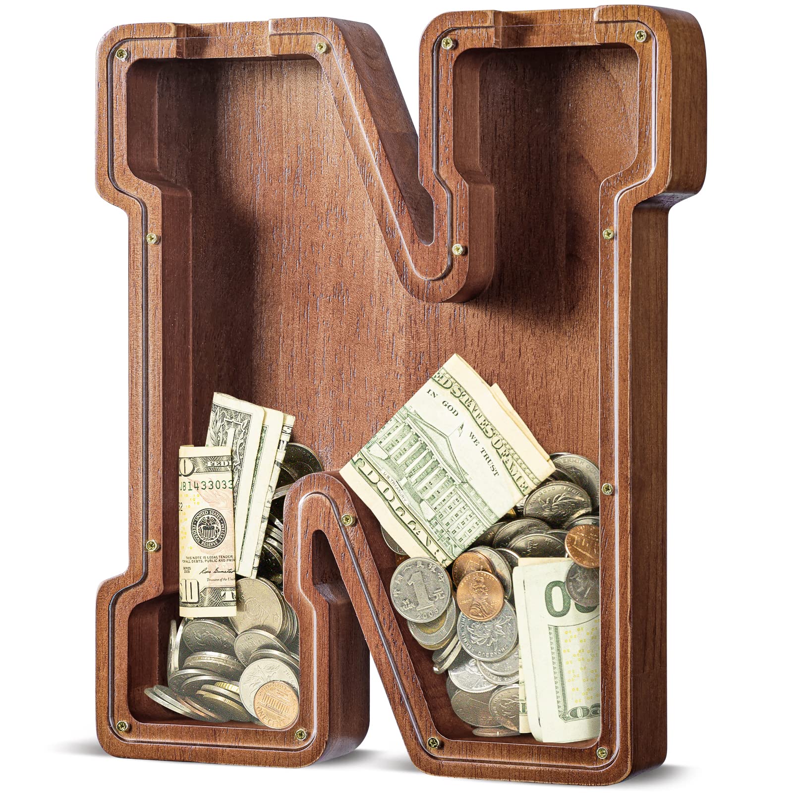 Customized Name Large Wooden Piggy Bank For Kids Boys Girls Alphabets Letter A-Z Coins Bills Money Change Bank Box Initial On Clear Cover (Laser Engraved) (Alphabet-N, Initial-12)