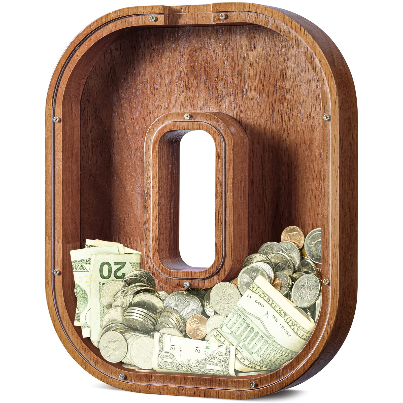 Customized Name Large Wooden Piggy Bank For Kids Boys Girls Alphabets Letter A-Z Coins Bills Money Change Bank Box Initial On Clear Cover (Laser Engraved) (Alphabet-O, Initial-12)
