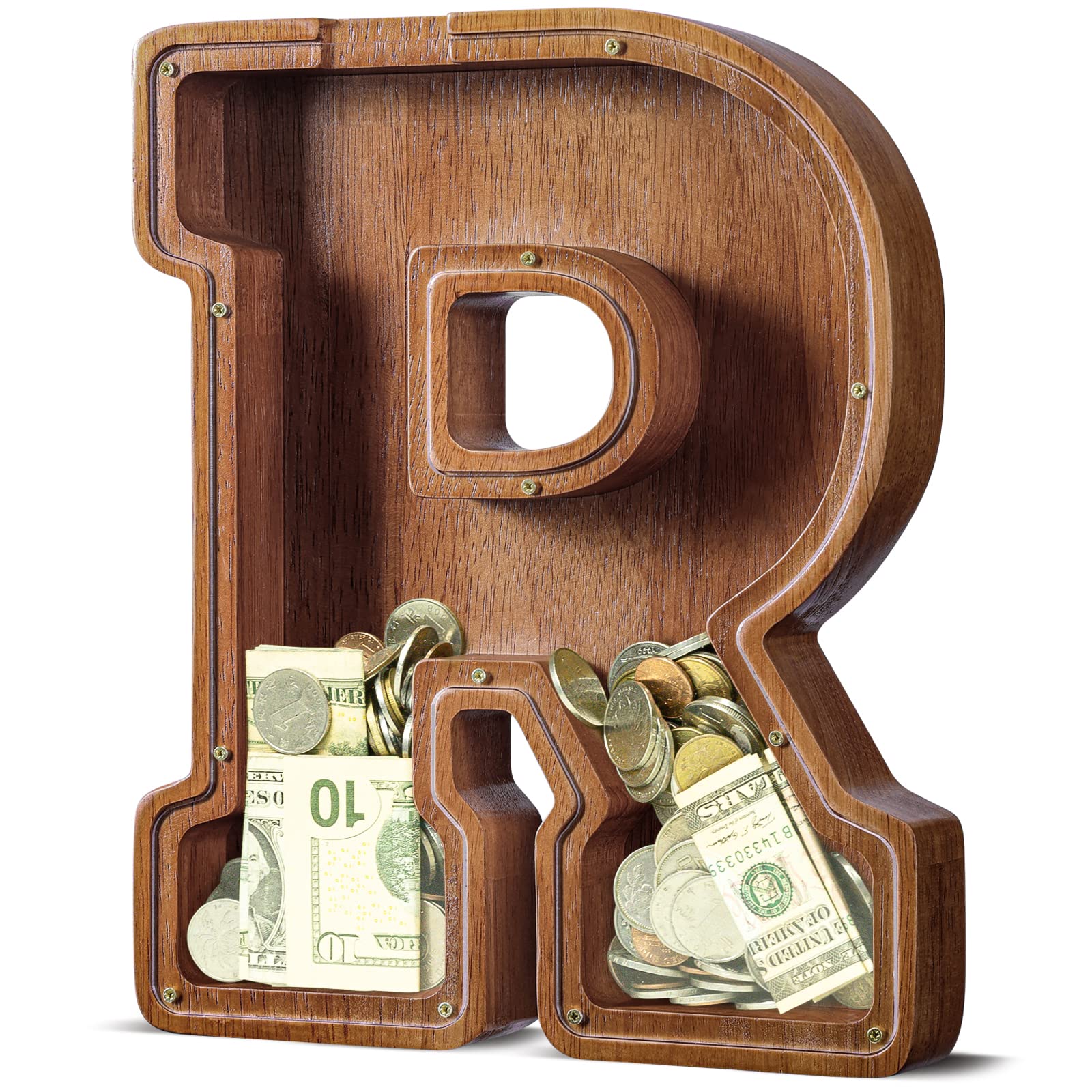Customized Name Large Wooden Piggy Bank For Kids Boys Girls Alphabets Letter A-Z Coins Bills Money Change Bank Box Initial On Clear Cover (Laser Engraved) (Alphabet-R, Initial-12)