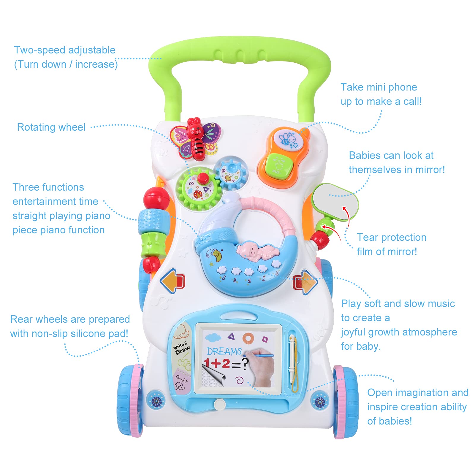 • Q: What features does the Cuterabit Baby Walker offer for learning and play? A: This baby walker includes a variety of engaging features such as a light-up piano, rotating wheel, mini phone, mirror, slip bead, and a magnetic drawing board to promote coordination and strength while providing entertainment.