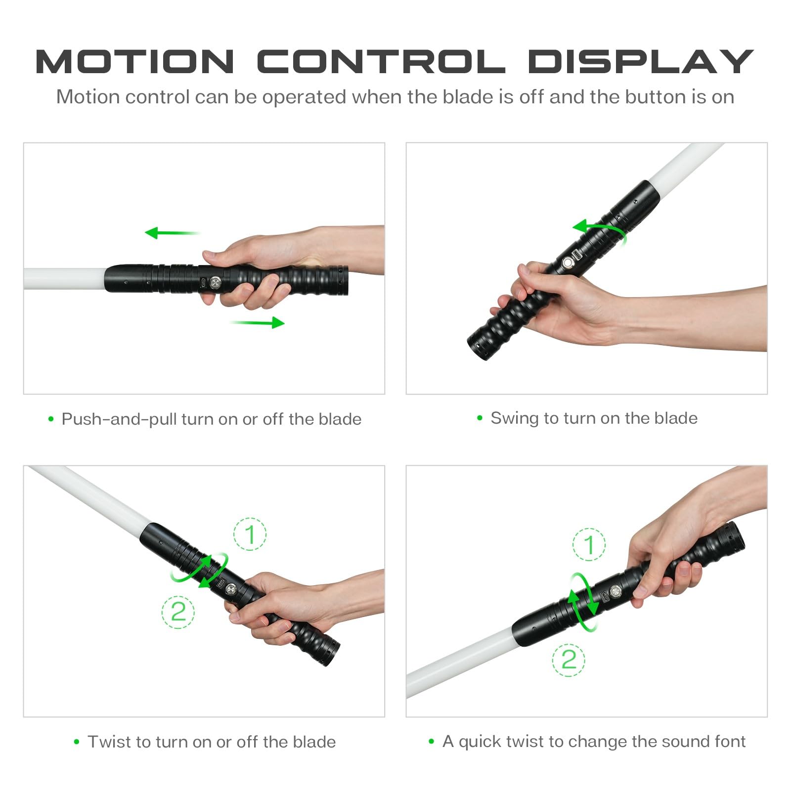 - Q: How does the motion control feature work on the CVCBSER FX Dueling Lightsaber? A: The motion control feature allows you to turn the blade on or off by pushing, pulling, twisting, or swinging the lightsaber, adding a realistic touch to your dueling experience.