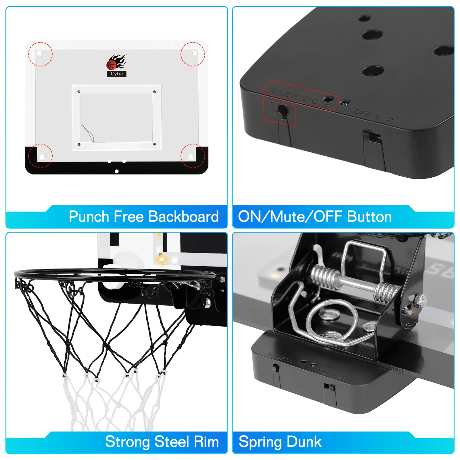 - Q: How does the scoring and countdown timer work? A: The scoring system features an infrared sensor that automatically counts your score each time the ball goes through the hoop. It also includes a 60-second countdown timer, with the first 45 seconds allowing 2 points per shot, and the last 15 seconds awarding 3 points for successful shots.