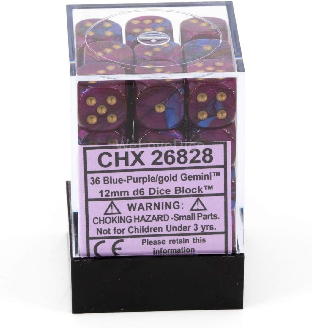 - Q: What games are suitable for using Chessex Gemini Blue and Purple D6 dice? A: These Chessex Gemini Blue and Purple D6 dice are ideal for Tabletop RPGs like Dungeons and Dragons, Shadowrun, Pathfinder, Savage World, and Warhammer. They provide the perfect dice for high damage rolls in these games.