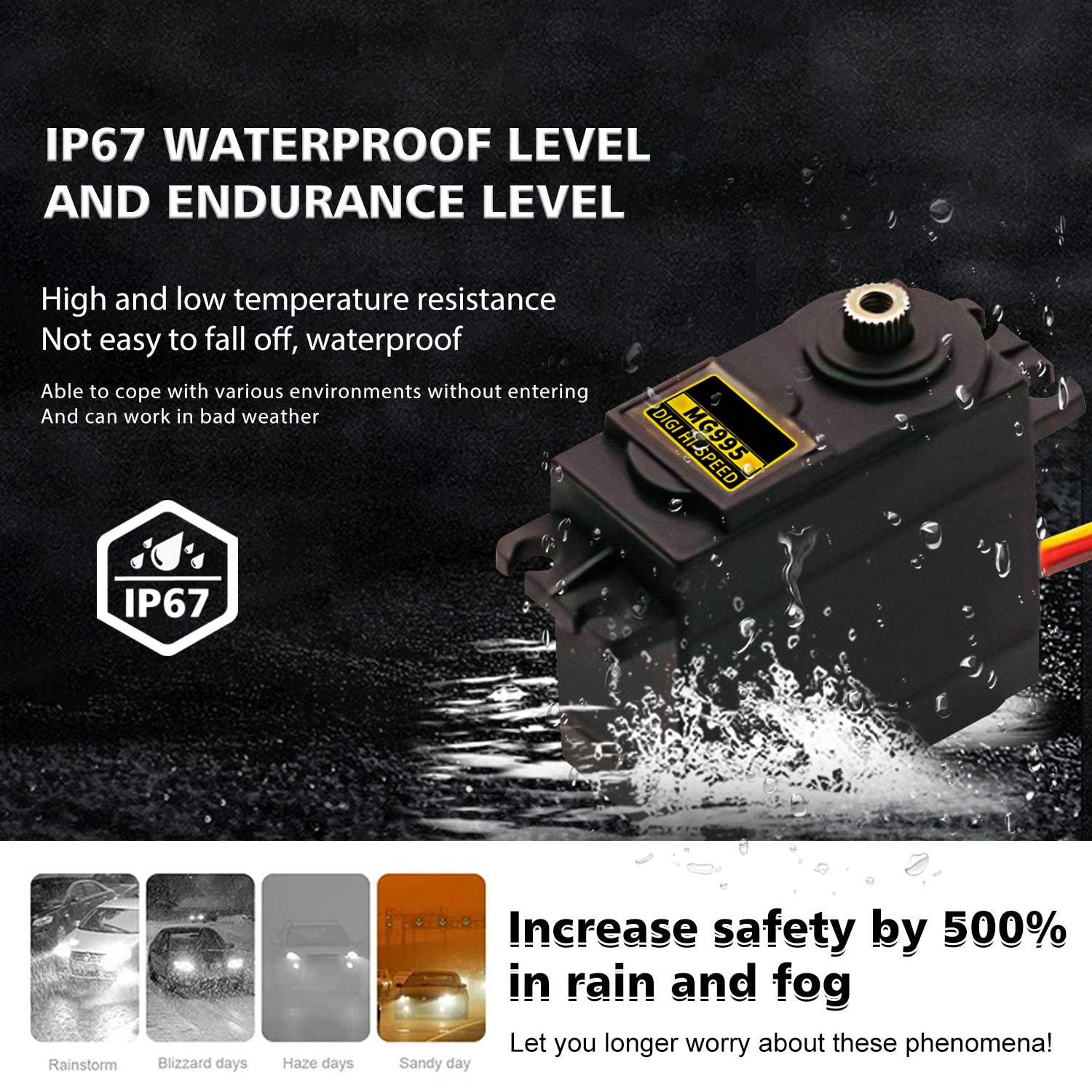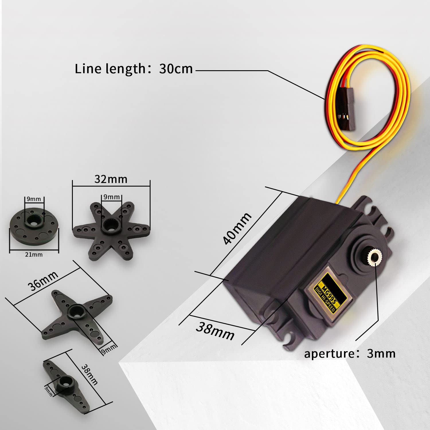 Specification: Connector Wire Length 300mm/11.8 inch Operating Speed: 0.17sec / 60 degrees (4.8V no load) Operating Speed: 0.13sec / 60 degrees (6.0V no load) Stall torque: 12kg/cm(6V), 13kg/cm(7.2V) Operation Voltage: 3.0V - 7.2V Gear Type: All Metal Gears Dead Band Width: 4us Plug Specification: JR FUTABA and so on Temperature range: -30 - +60deg Item Size: 40.7*19.7*42.9mm(1.6*0.78*1.69inch) Servo Weight: 55g Connection: Red Wire: + Yellow Wire: PWM/Signal Brown Wire: GND