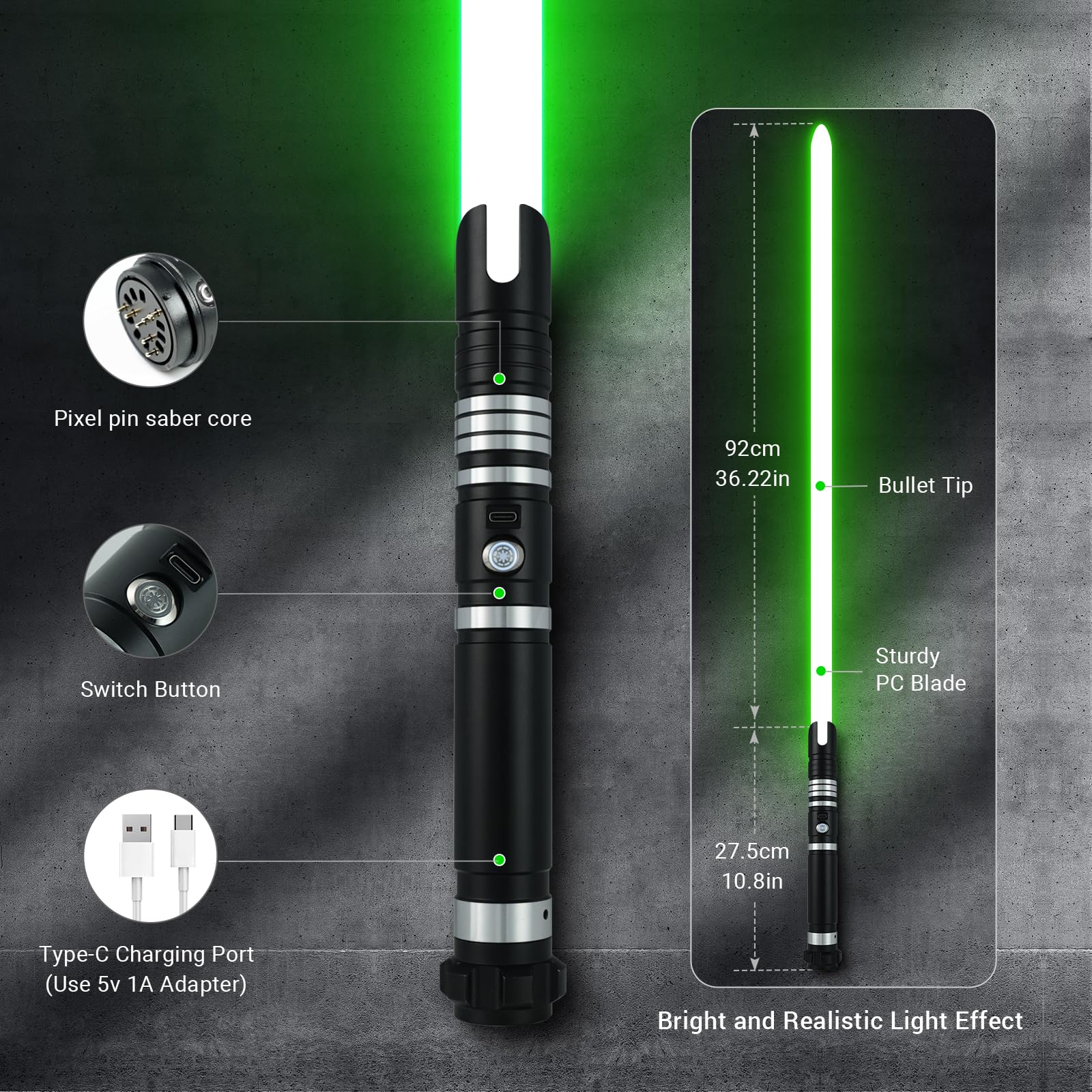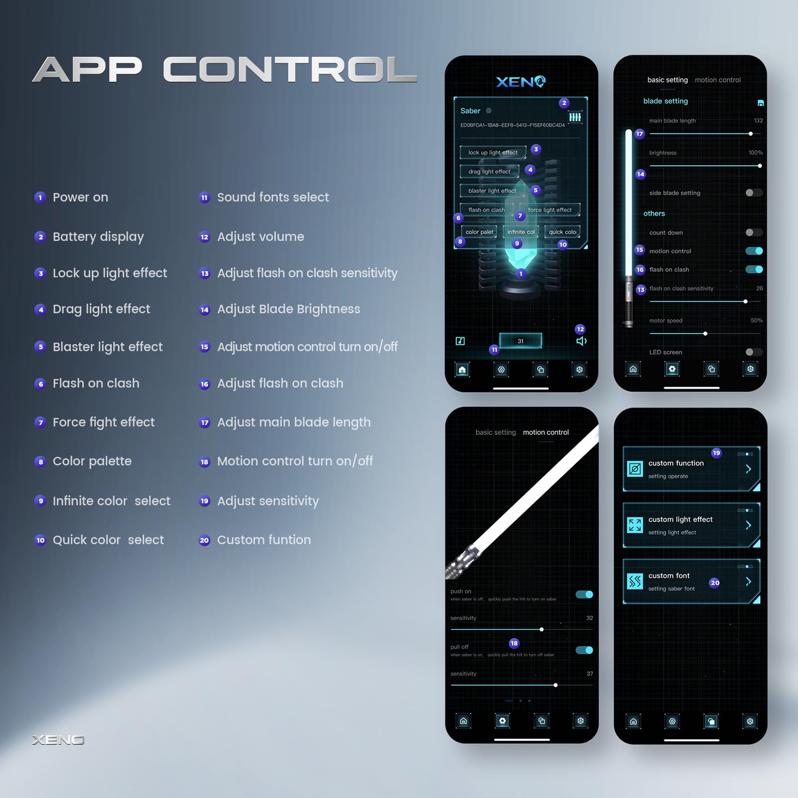 - Q: How does the Xenopixel V3 APP enhance the usage of this light saber? A: The Xenopixel V3 APP allows you to manage battery status, adjust volume, and customize sound and light effects directly from your smartphone. This feature minimizes accidental button presses and provides a more interactive experience.