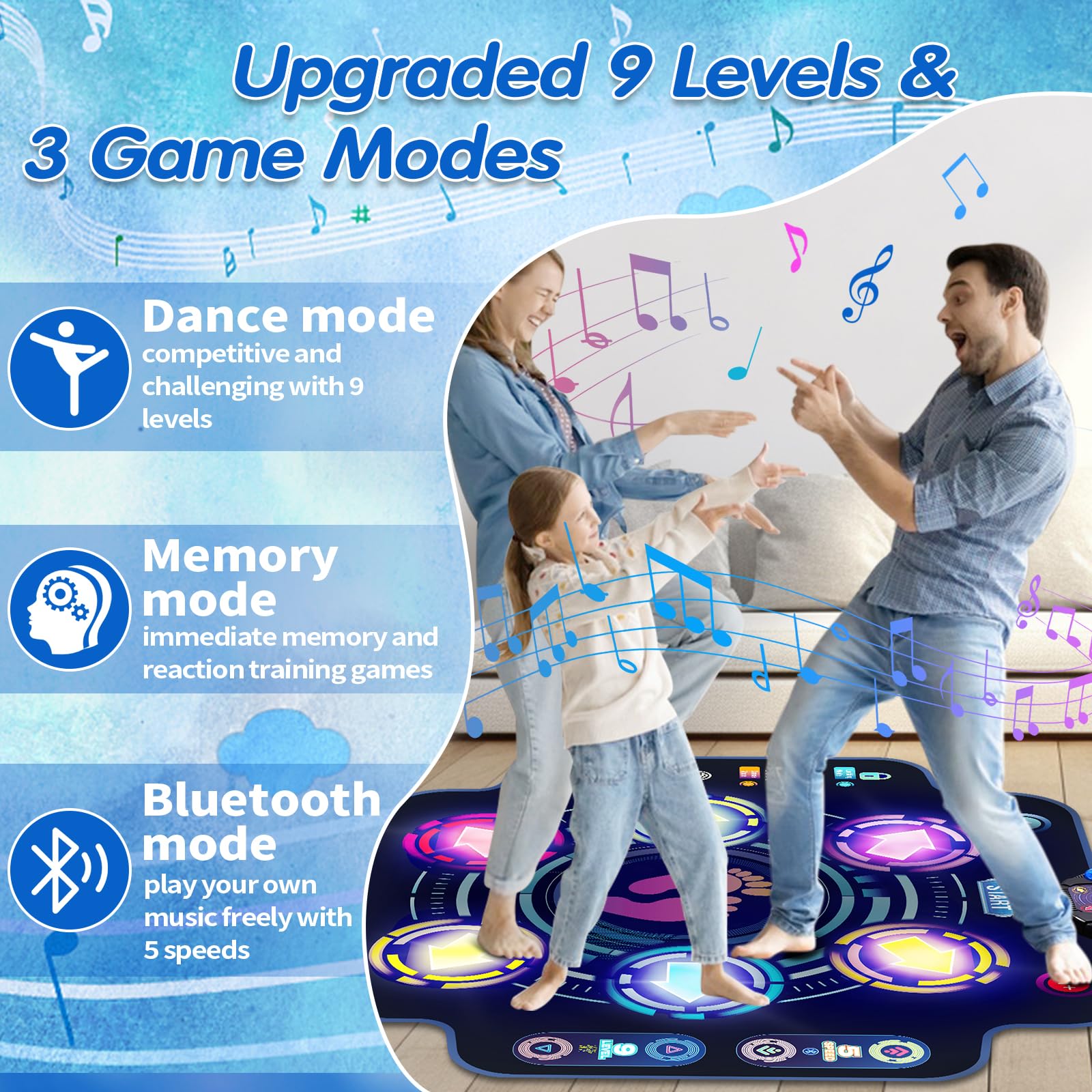• Q: What are the different modes available on the dance pad? A: The dance pad includes three fun modes: Dance Challenge Mode with 9 difficulty levels, Wireless Bluetooth Mode for playing your favorite songs, and Memory Mode which challenges kids to remember flashing light patterns.