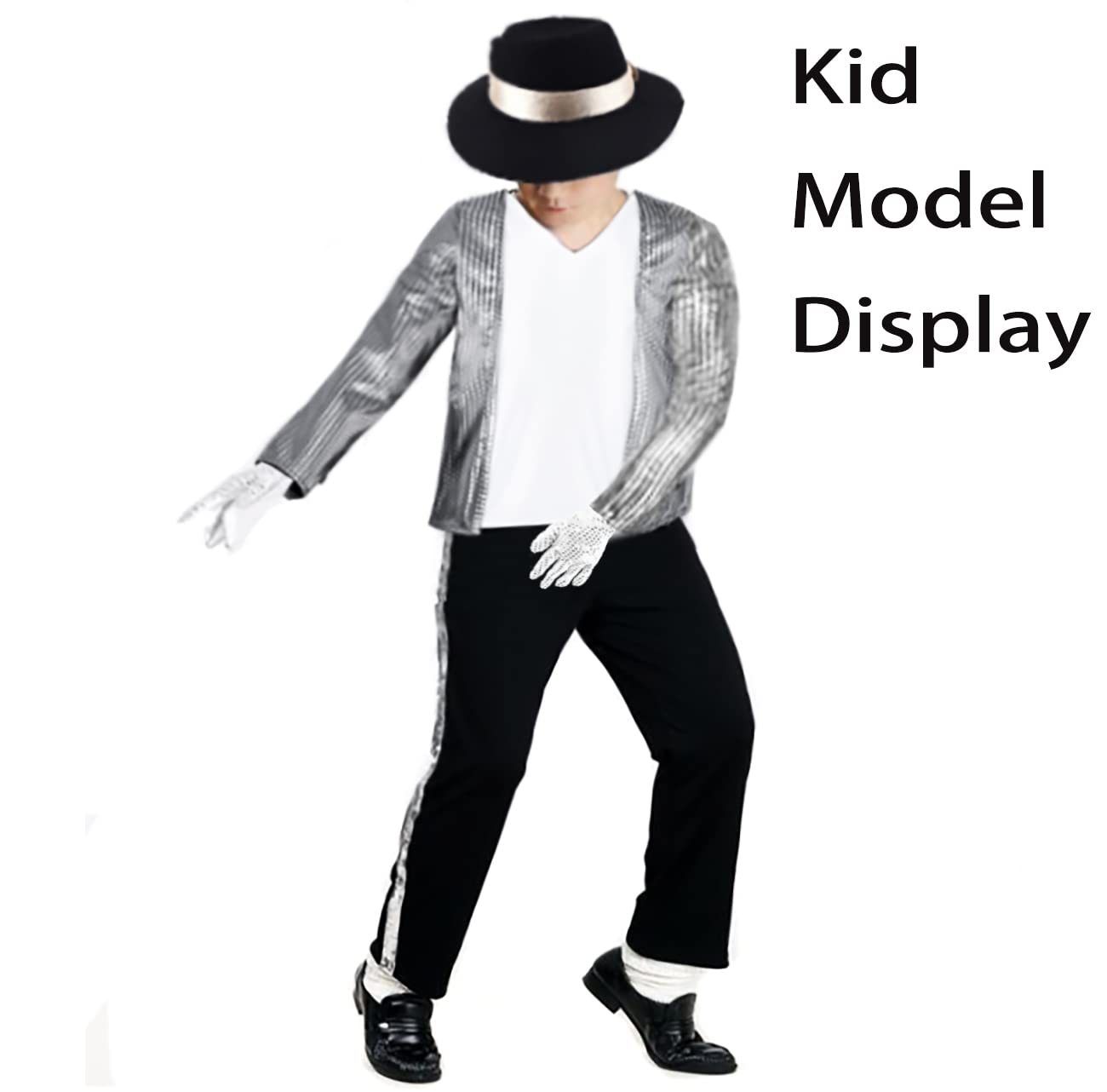 5Pcs Set: 'Shiny Sequin Shirts'+ Pants+ Hat+1 Pair Of Gloves+Sunglasses. | Size: If Your Child Is Overweight, Please Choose A Larger Size. | Features:Shiny, Silver Sequined Shirt, Iconic Black Hat, White Personalized Sequin Gloves, Pants With Side Paneling. | Medieval:Polyester+Sequin Material.Note:The Hat Might Have Been Deformed During Shipping Due To Compression. We Hope For Your Understanding. | Occasion: Suit For 80S 90S Dance, Dance Star Cosplay, Mj Fans Role Play, Birthday,Halloween, Christmas Cospaly, Carnival,Dress Up, Easter,Role-Playing,Musical, School Show, Dance Recital Party,Stage,School Show, Photo Prop, Events, And Everyday Fun.