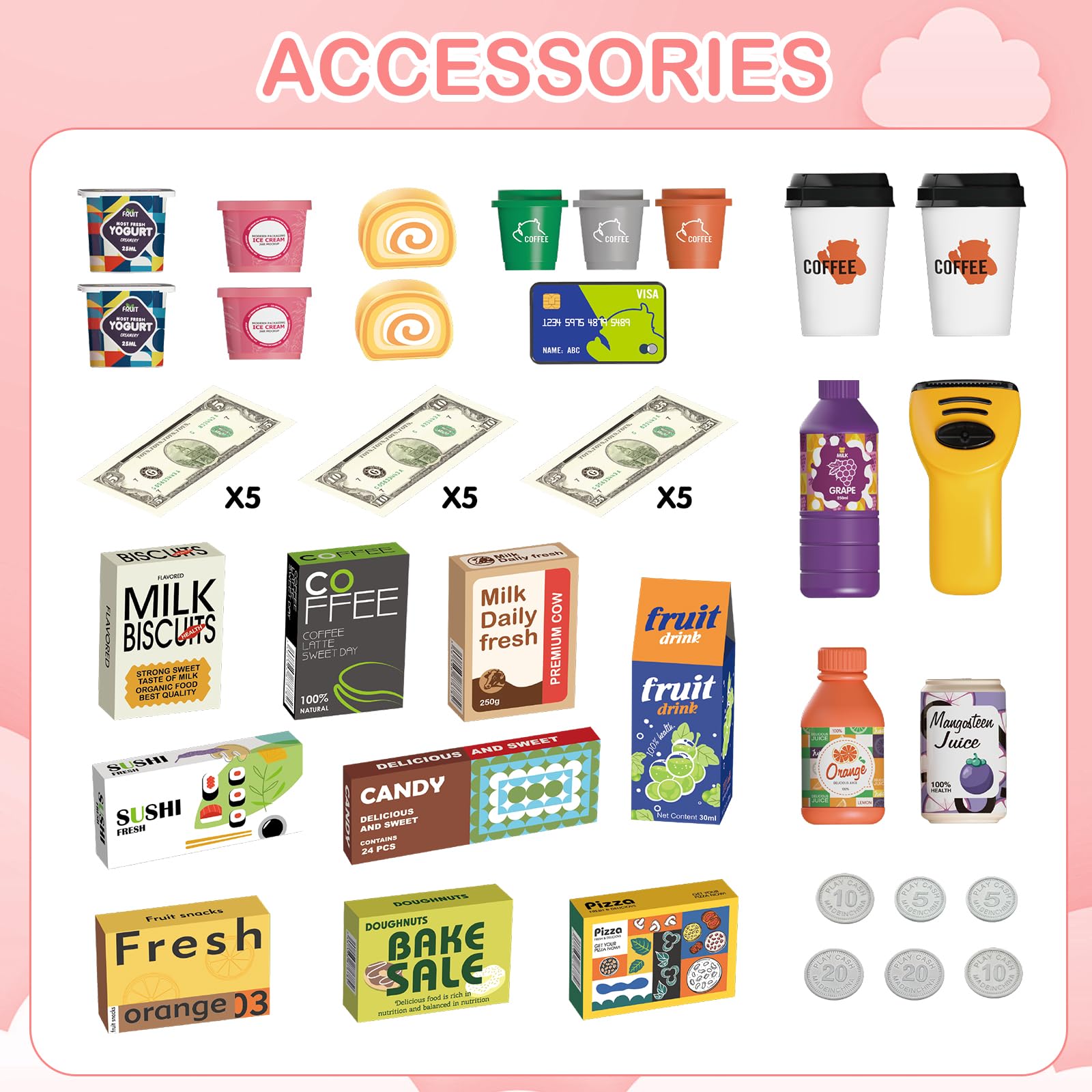 Toy Cash Register:deAO 3 in 1 Supermarket, coffee machine, fridge toy , our coffee maker has a new press to dispense water function! This innovative toy lets your child explore the realms of both running a coffee shop and managing transactions at a cash register, not only will this entertain your child for hours on end but it also includes a variety of shopping accessories that your child will love.