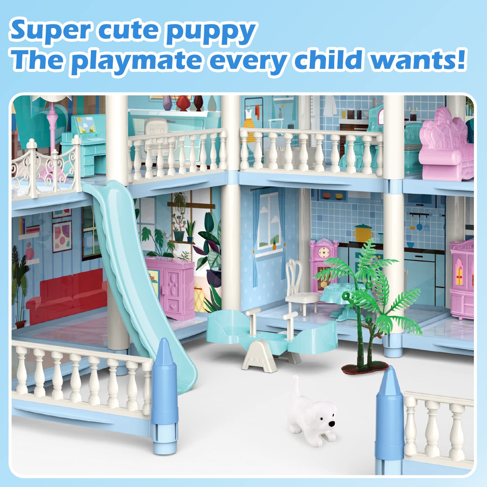 - Q: How many balconies does the dollhouse have? A: The dollhouse includes three balcony areas. These unique features enhance the imaginative play experience for children.