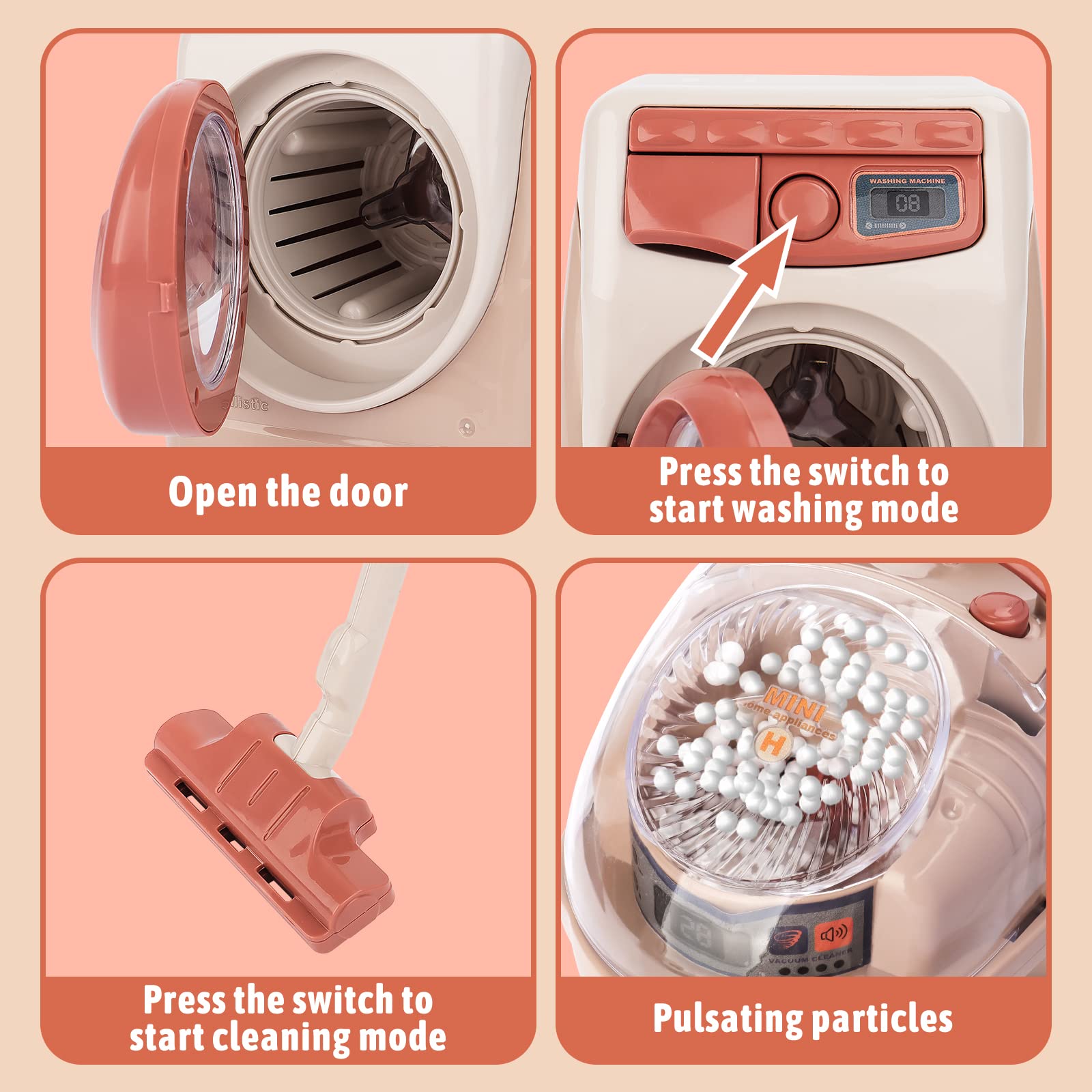 Deao Toy Washing Machine & Vacuum Playset For Kids, Mini Washing Machine Laundry Set For Kids,Dollhouse Furniture Laundry Room W