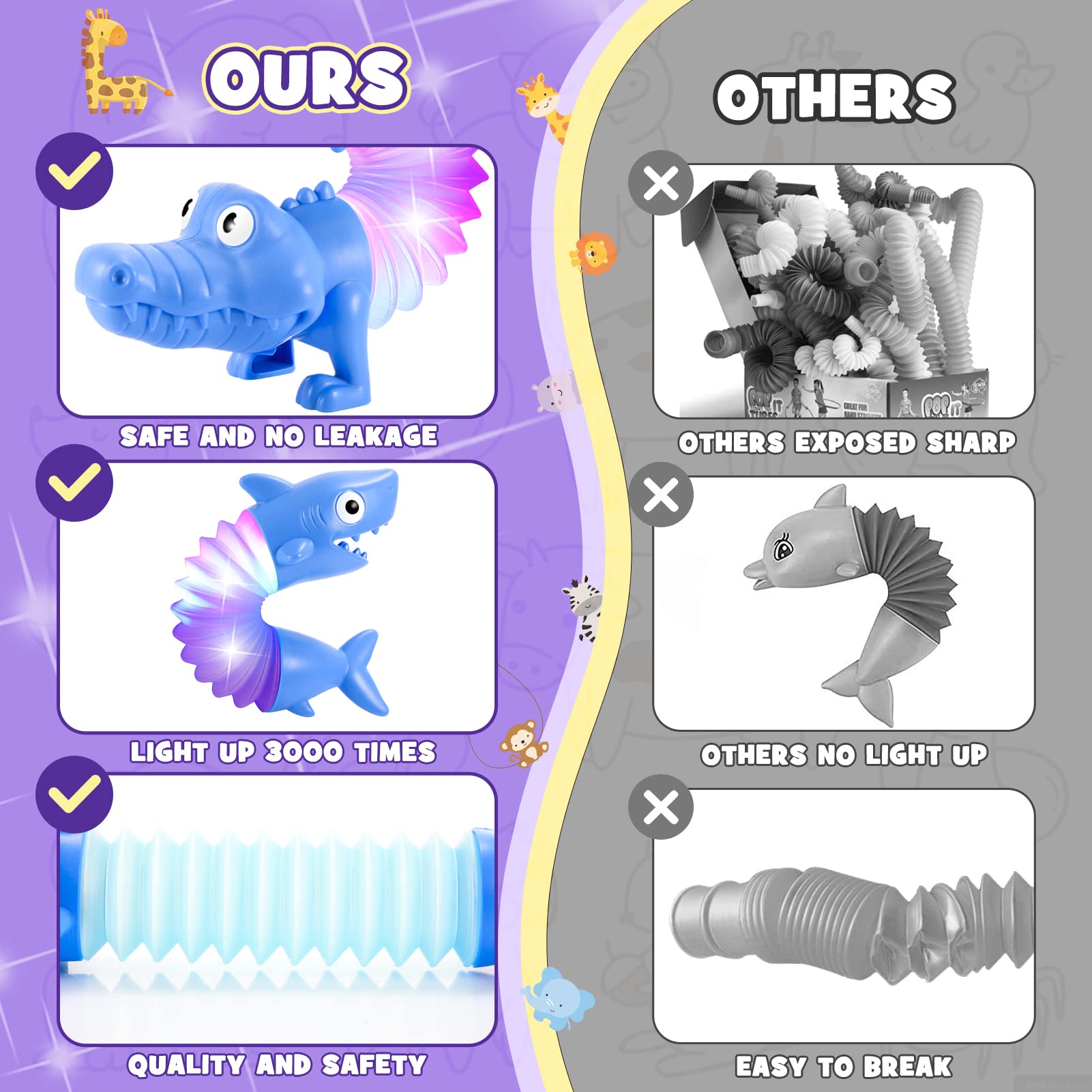 - Q: How do the LED lights in the pop tubes work? A: The animal pop tubes feature colorful LED lights that flash when shaken, providing a fun and engaging experience for your child, both during the day and at night.