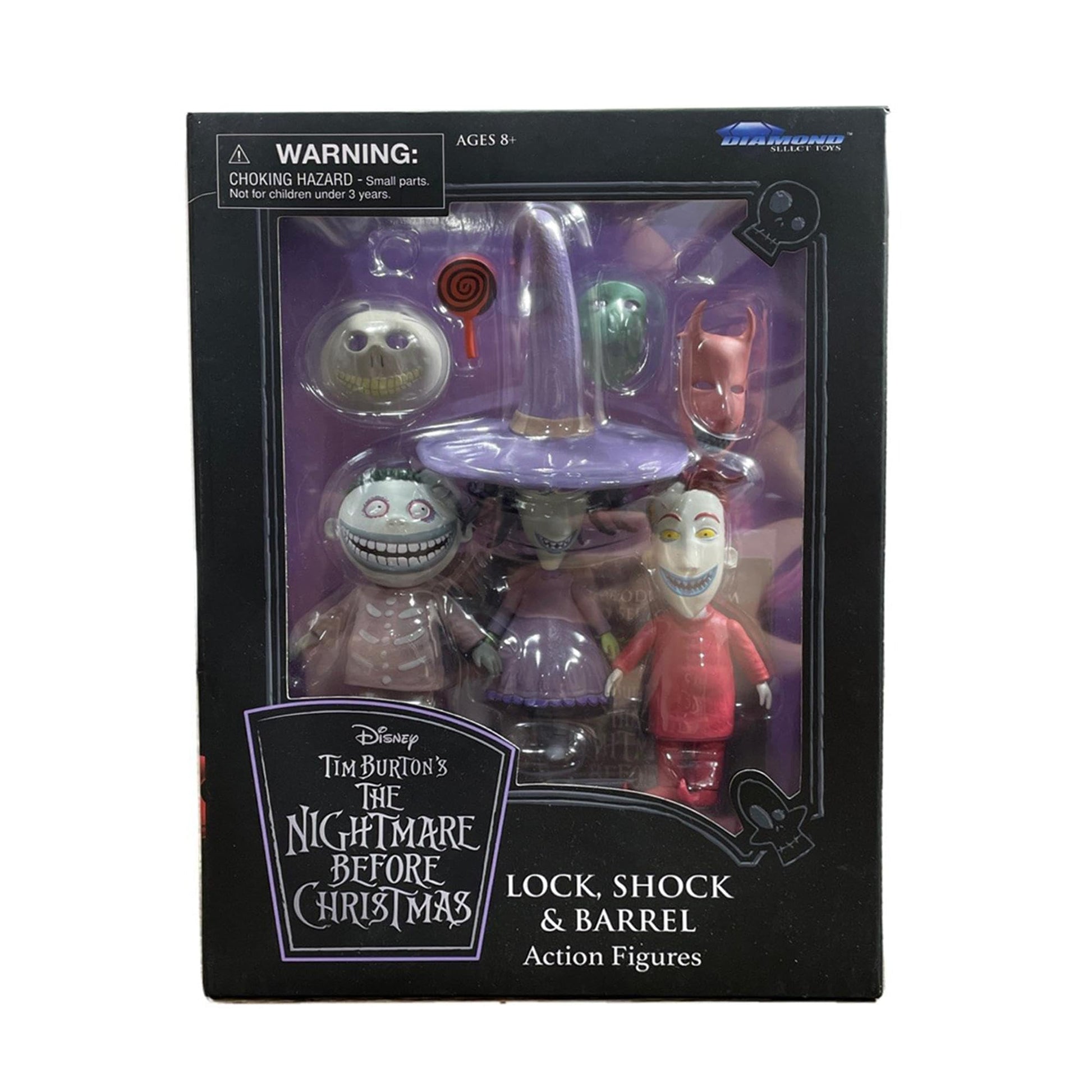 - Q: What is included in the Diamond Select Toys Nightmare Before Christmas Lock, Shock, and Barrel action figure set? A: The set includes three action figures: Lock, Shock, and Barrel, packaged in a full-color window box with a hang tag. Please note that diorama pieces are not included.