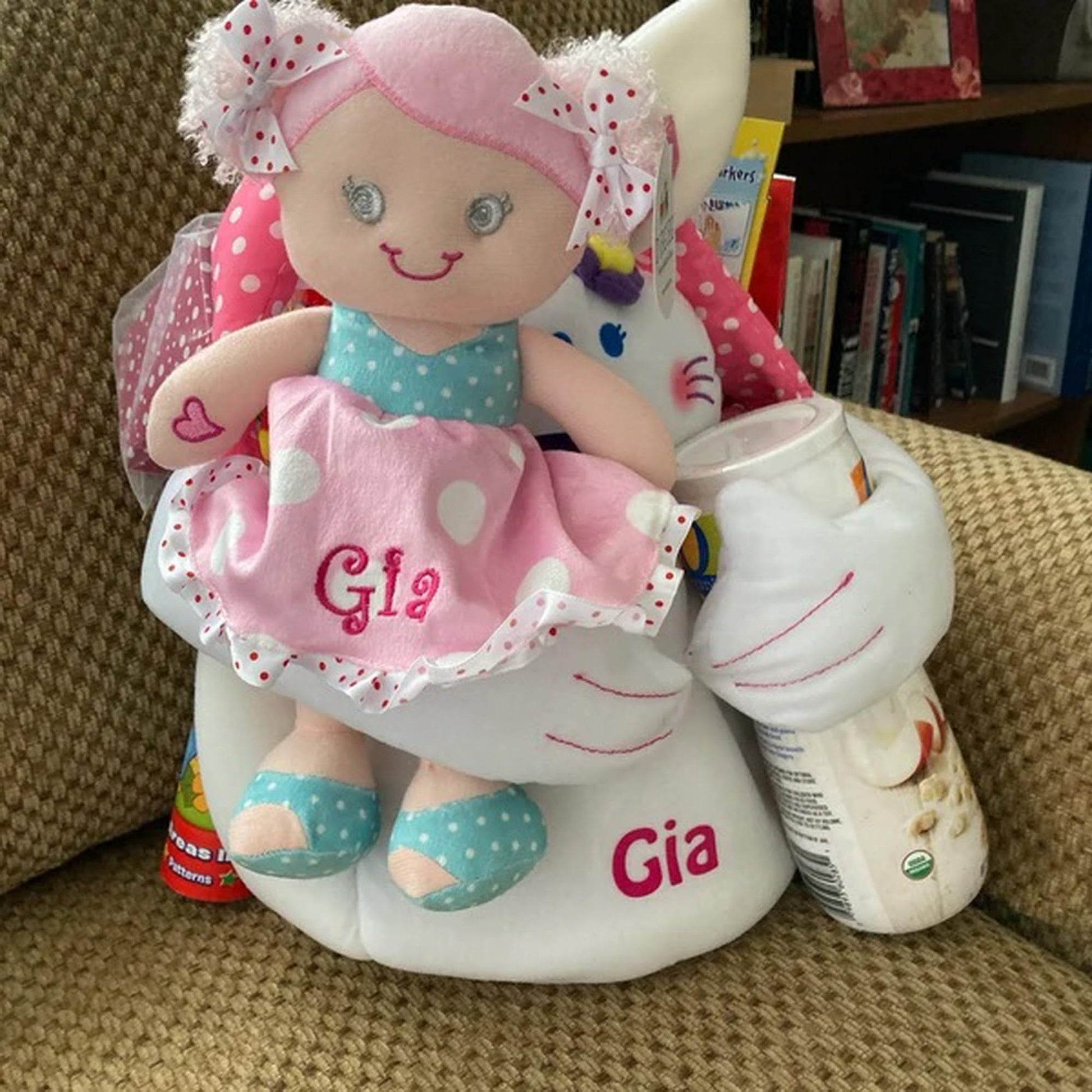 DIBSIES Personalization Station is now providing the ability for large online retailer.com shoppers to personalize this incredibly popular Plush Snuggle Doll 11 Inch- Pink Hair. What an adorable Dolly for your Little One. Just the right size for her little hands to carry. Our Personalized Plush Snuggle Doll is the best companion for her. The perfect First Doll that she will love! Make it her own by adding her name. Gift your most precious little girl with our Plush Snuggle Doll. . * Personalization is included ( up to 9 letters maximum) in embroidery as shown. Only the first letter in caps. No special/foreign characters please. *Light pink polka dot dress with satin underside. * Mint green shoes and polka dot accents. Fuzzy pink hair and hair bows. Perfect for little hands to carry
