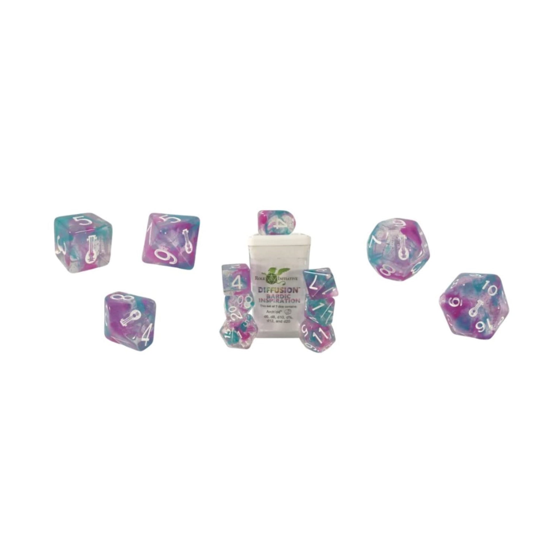 - Q: What colors are the dice in this set? A: The dice are diffused magenta and teal with pink glitter and white ink. This vibrant color combination enhances visibility during gameplay.