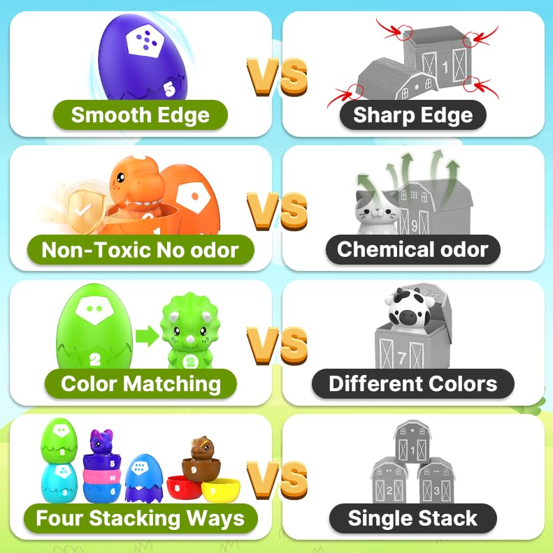 - Q: What educational benefits do these toys provide? A: The Dinosaur Baby Learning Toys promote color recognition, number learning, and classification skills, as each dinosaur is printed with numbers 1 to 10 and is color-matched with the eggs, supporting Montessori learning principles.
