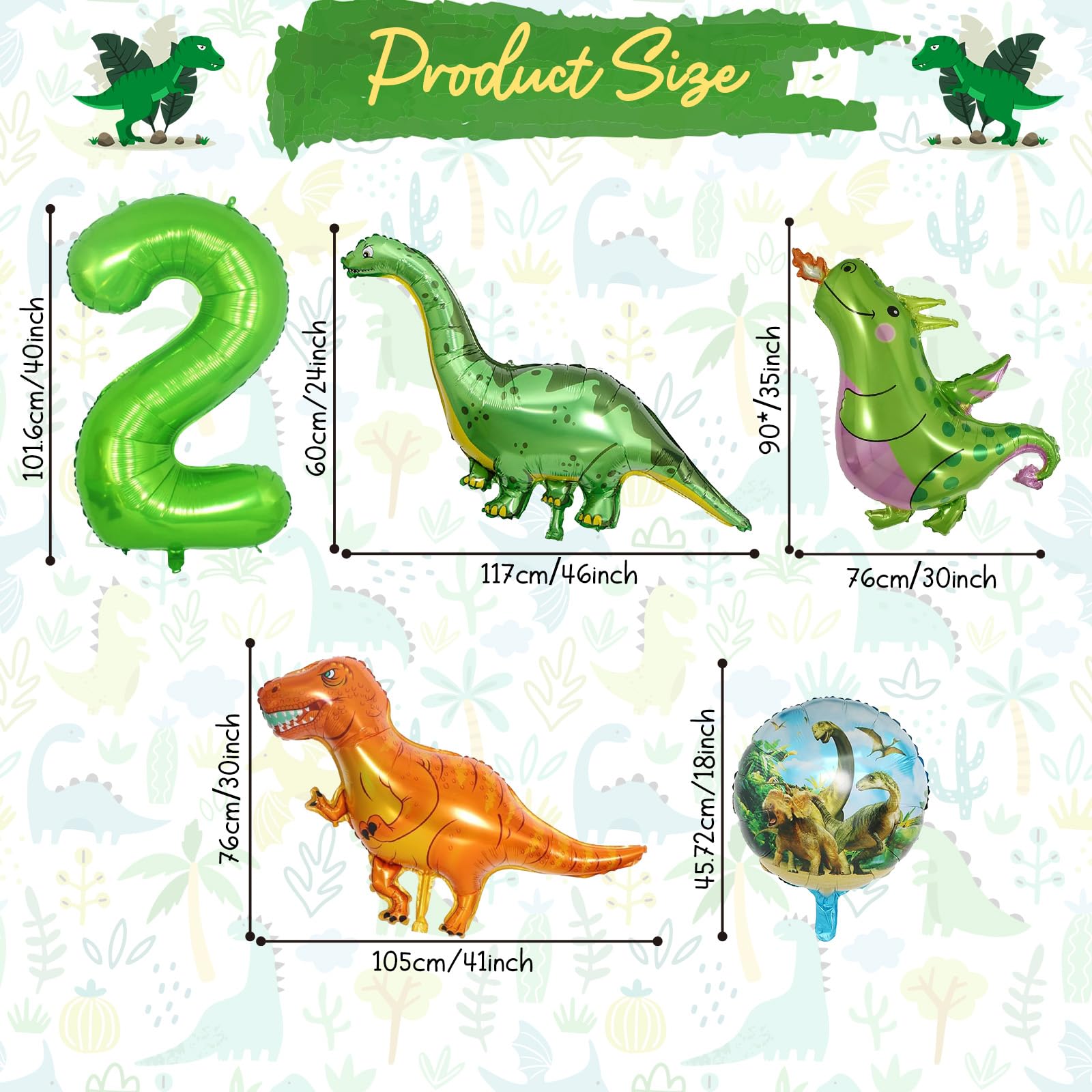 - Q: What size are the balloons included in the decoration set? A: The decoration set includes a variety of balloon sizes, including a 40-inch green number balloon, a 35-inch fire-breathing balloon, and several smaller dinosaur-shaped balloons, providing a dynamic display for your party.