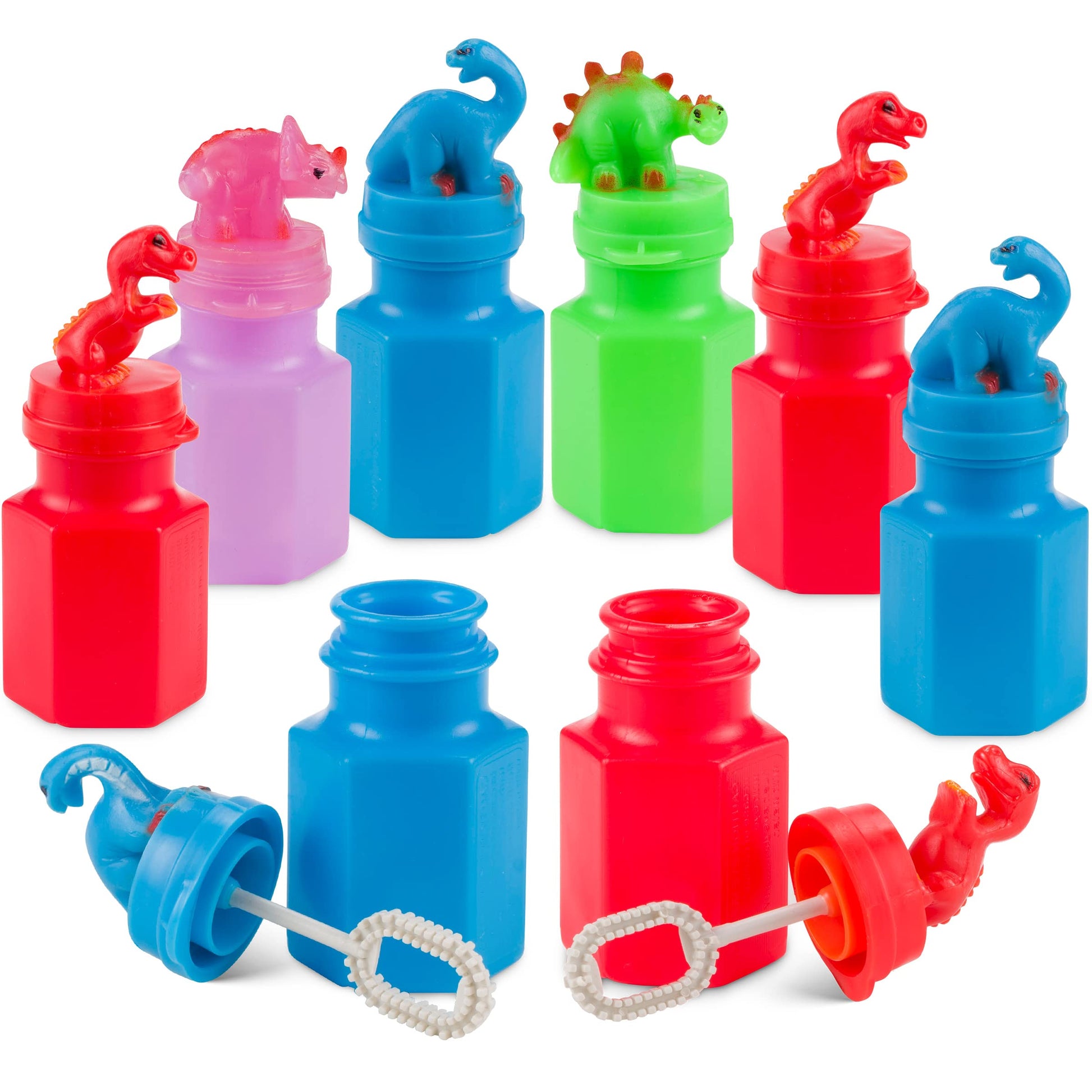Bulk Dinosaur Bubbles Party Favors for Kids - Pack of 12 Everyone can join in the fun with Bedwina Dino Bubbles for Kids. Each pack of dino bubbles for kids and toddlers includes One Dozen 3-inch bubble bottles with wands and contains 2.0 fl oz of bubble solution. You'll receive a total of 12 dinosaur themed bubbles in assorted colors and styles. The assorted dino bubble bottles will arrive neatly package in a sturdy display box and colors include red, blue, green, and pink. They are Quality Made, feature screw top lids with a bubble wand attached. Packaged in a sturdy display box so you wont have to worry about them breaking or leaking during transit. Spend less time worrying and have more fun with your little ones! Great Party Favor Idea for Little Dino Lovers! Are you ready to put a smile on your little ones faces!? Give your next party a unique and memorable dinosaur party favors with these bubble wands for kids. Perfect for stocking stuffers, Easter baskets, Halloween, birthday gifts for kids, party favors, treasure and prize chests, carnival prizes, dentist office prizes, goody bags, treasure chests, game rewards and more. KEY FEATURES: - Bulk Pack of 12 - (1-Dozen) Dino Bubbles for Kids - Assorted Neon Colors: Red, Blue, Green and Pink - Bottles Measure 3-Inches Tall / Contains 2 Fl Oz - All Bottles Include a Wand Attached to Lid Inside - Double-Sealed to Prevent Leaks and Spills During Transit - Arrives Neatly Packaged in Sturdy Display Box - Non-Toxic and Safe - Fun for Ages 3+ - Perfect for Party Favors & Gifts Why Wait!? Click ''Add to Cart'' to order your dinosaur bubbles for kids in bulk today!