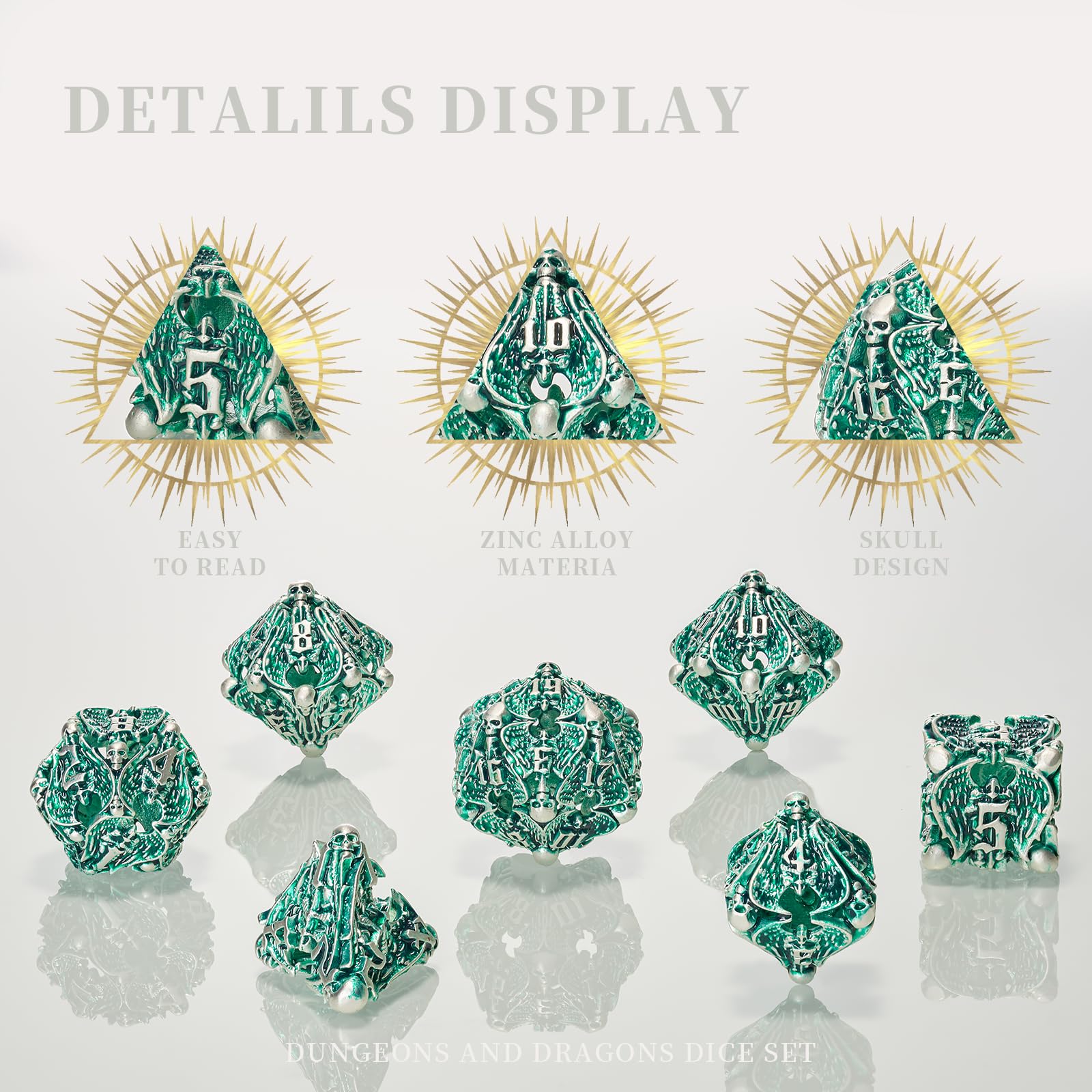 DND Dice,HNCCESG Hollow Metal Set 7 Pcs for Dungeons and Dragon,D and D GIFS of Tabletop Game (Matte Green White Skull)