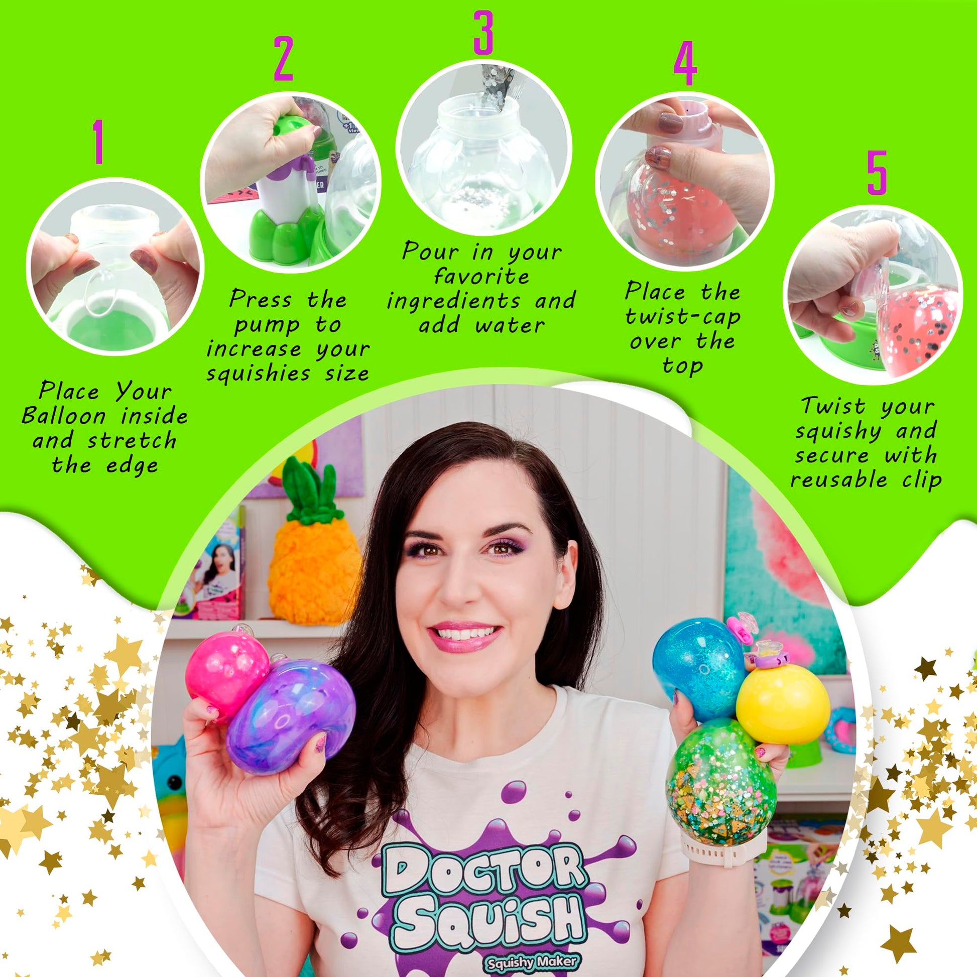 - GLOW IN THE DARK REFILL KIT: Enhance your squishy collection with Doctor Squish's Glow in the Dark Squishy Pack Refills. Includes 6 TPR balloons, glow slime powder, glow sparkles, and 6 reusable clips. Squishy Maker not included.