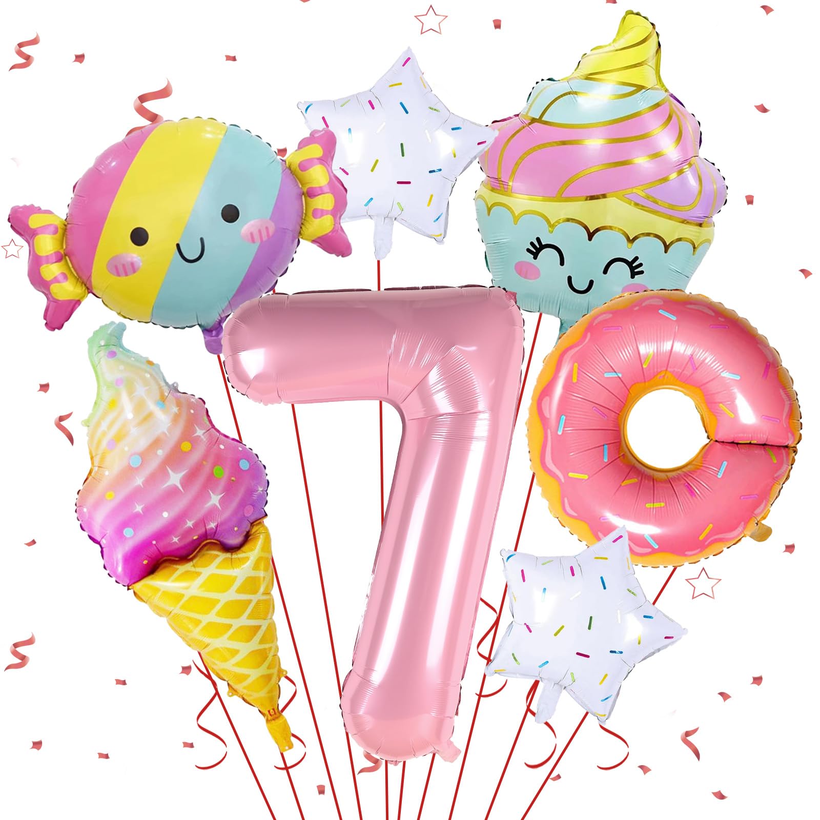 - Q: What sizes do the balloons come in and how many are included? A: This set includes a giant 40-inch number balloon, along with assorted designs such as donut, candy, and ice cream balloons, providing a fun and colorful decoration for your 7th birthday party.