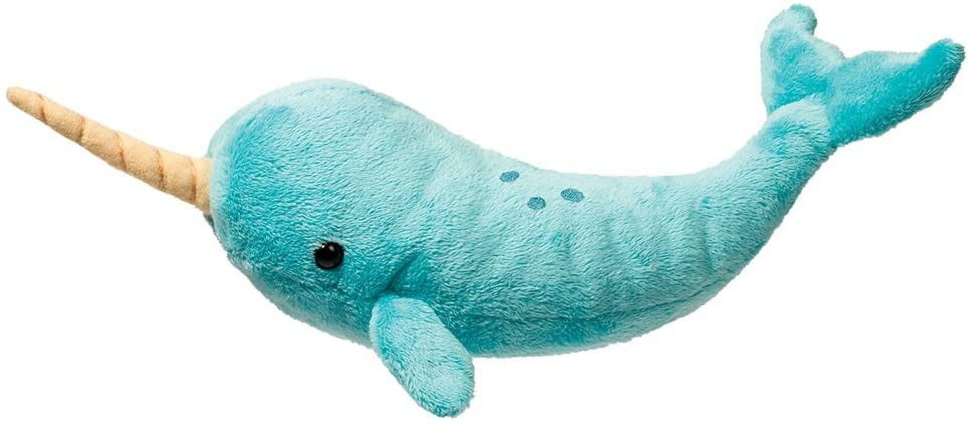 Product DescriptionKnown as the unicorn of the sea, the Narwhal is no stranger to the mysteries of the ocean and the magic it holds. Our plush Narwhal, Spike, whiles away his time exploring its waters with his friends. This fanciful whale stuffed animal features a bright turquoise color and a handsome spiraled tusk. Soft to the touch and exceptionally cuddly, quality polyester fill within makes Spike a huggable pillow friend. Bubble accents dapple his back while his playful, dark eyes shine with excitement. Maybe you will join him on his next imaginative quest across the sea. Who knows what fun and adventures may lie in store!Set Contains:1 x Spike Jr. Blue Narwhal
