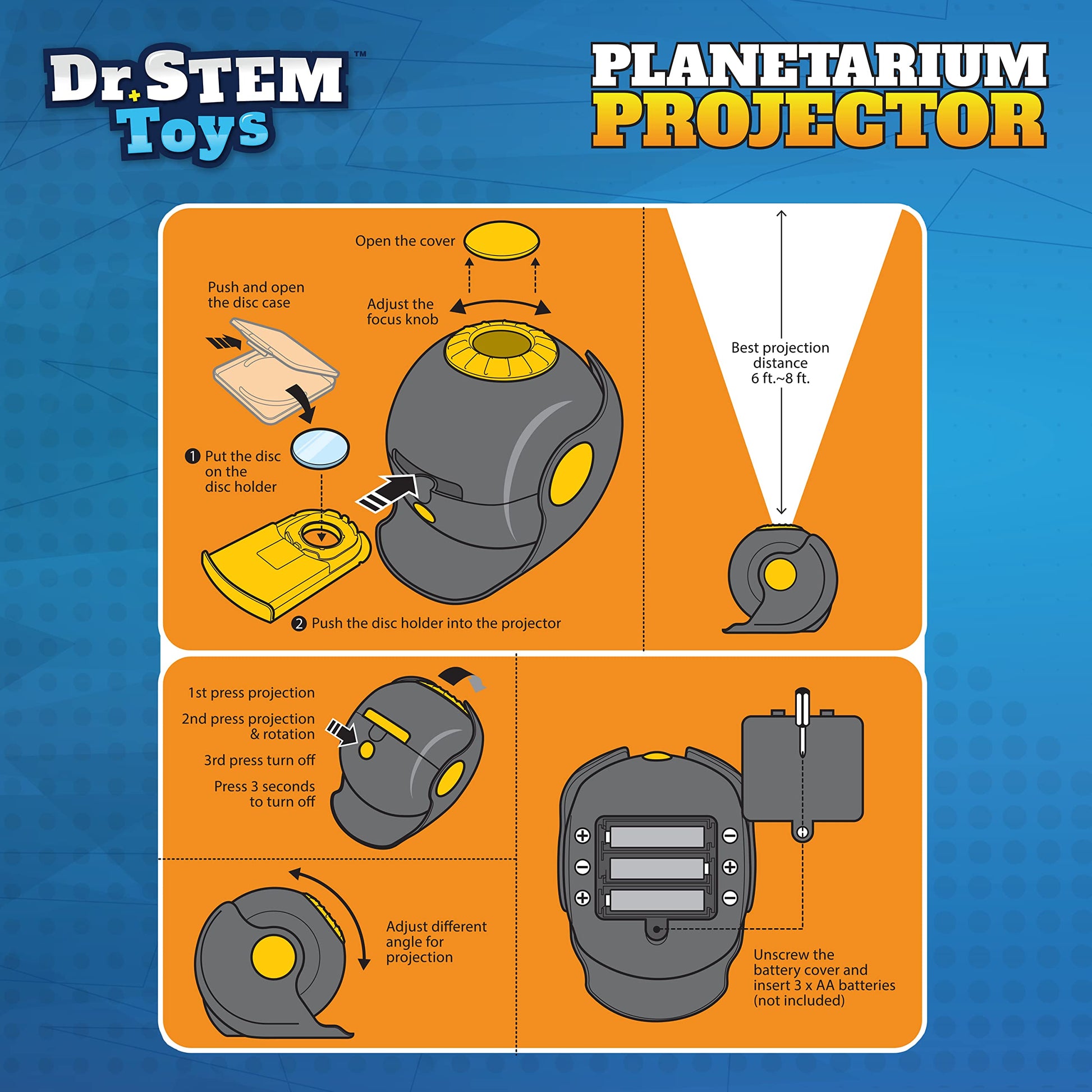 Give Them the Sun, the Moon & the Stars: Dazzle your kids with this motorized planetarium projector. As it rotates, it beams glowing stars & planets up to 12 away for a stunning galactic light show. | Choose from 4 Luminous Options: This versatile starlight projector provides 4 colorful discs. Insert your desired disk & enjoy the eye-popping spectacle - earth, sun, 7 planets & the entire galaxy. | Children Learn as They Play: Unlike other projector lights for bedroom use, this cool constellation projector comes with an educational booklet featuring 10 colorful pages packed with fascinating info. | Easy to Use: Simply insert 3 AA batteries (not included) into your night sky projector. Then slide in a disc, adjust the focus & angle, and press the button to project images for up to 30 minutes. | Gift-Boxed & Guaranteed to Please: Your Dr. STEM Toys Space Projector arrives in a kid-pleasing box.