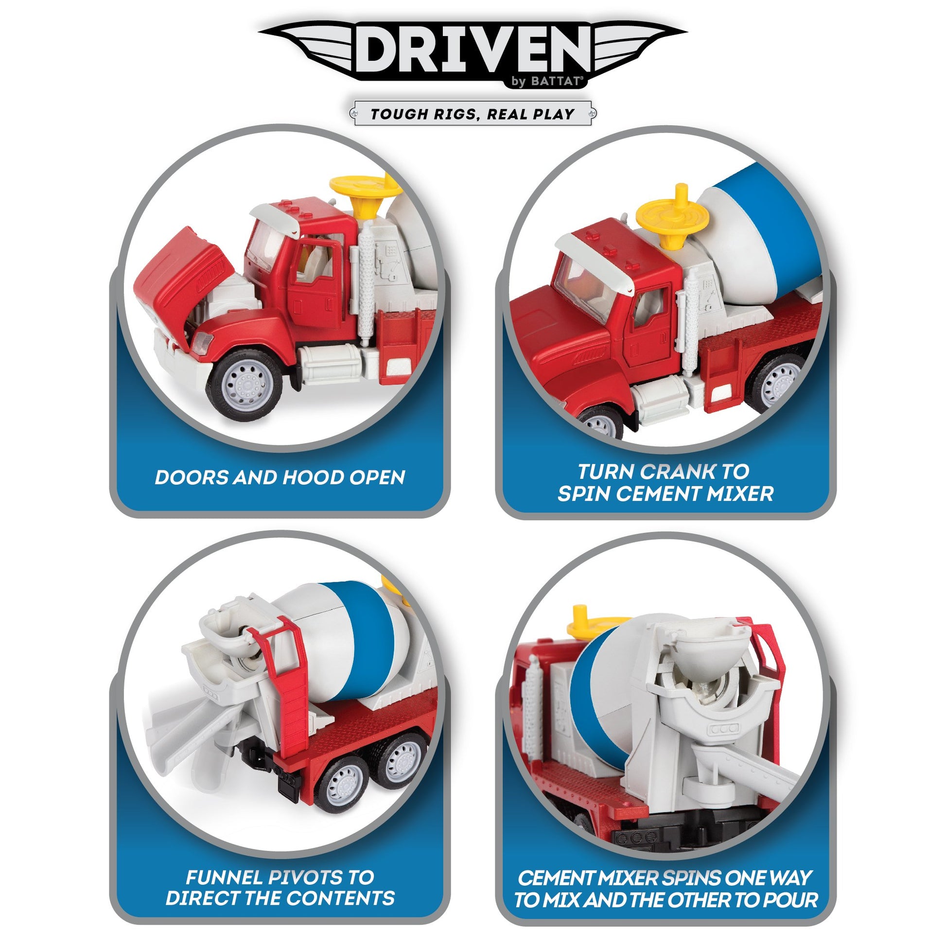 Got a big job that needs doing around town? Here comes the Micro Truck Fleet from DRIVEN by Battat! This colorful bundle of toy work vehicles includes the Micro Cement Truck, Micro Backhoe Loader, Micro Dump Truck, and Micro Crane Truck. Together, these crew members will get the job done in a jiffy! Want to build a road? Turn the crank on the cement truck to spin the mixer, then pour its contents out the back funnel. Then, carry a load of gravel in the dump truck, just like the real thing! If you need to hoist something up high, roll the crane truck into position. Don't forget the Backhoe Loader for all your construction needs! Every vehicle in this bundle features realistic lights and sounds, and are durable for hands-on, imaginative play - perfect for kiddos with loads of energy! Remember, stay DRIVEN because the crew depends on you!