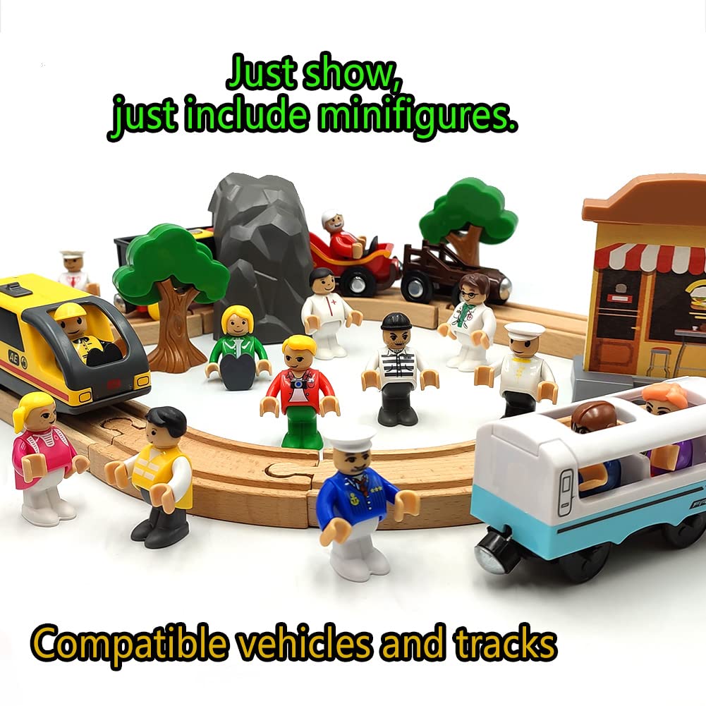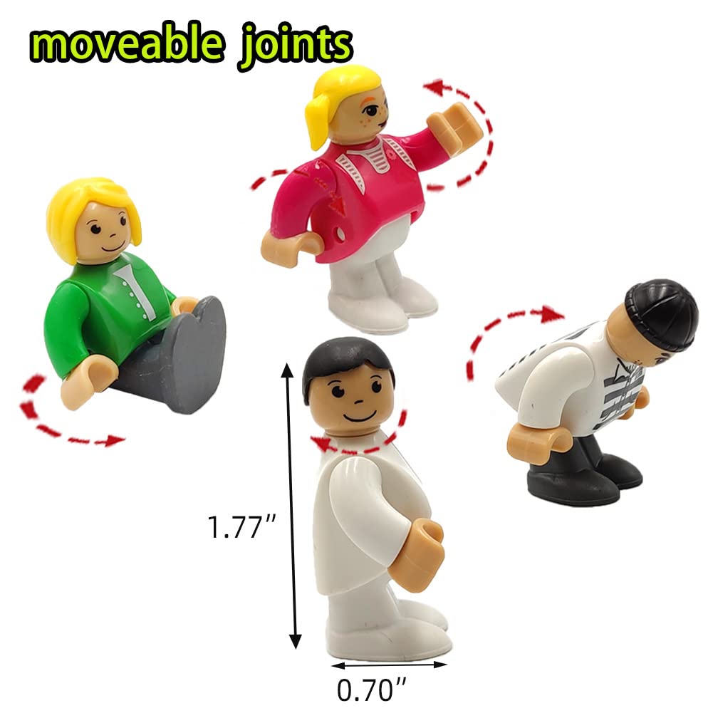 1.Include - this listing include 14 pieces different figures( 3 Office Clerks , 1 Waiter , 1 Doctor , 1 Nurse , 1 Teacher , 1 Journalist ,2 Captains ,1 Driver , 1 Pilot , 1 Gang ,1 Father Christmas ),not include any trains cars track. 2.Durable Quality and Size - These min figures made by plastic and toxic-free ,Height is 1.77 inches . They have no detachable parts and are so well-made. 3.Moveable Joints- The pretend play toys for kids have moveable joints for more fun. The head ,hands , arms can moveable and legs can sit. Fits into the driver's seat in many toy train, cars and trucks as picture show. 4.Imitate and Learn - Whenever kids hold these little people figures for boys and girls in their hands, they will imitate the characters and learn about their daily lives. 5.Perfect Gifts - Parents know that kids learn best through play. The bendable figurines also improves gross and fine motor skills.