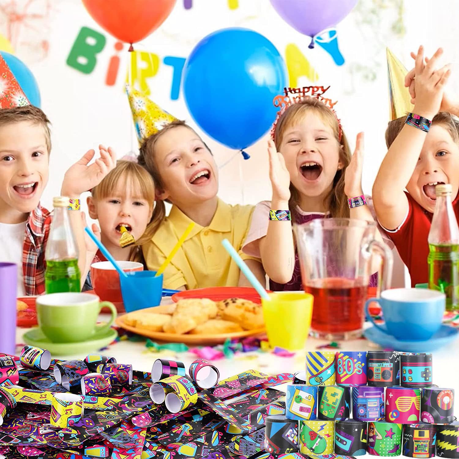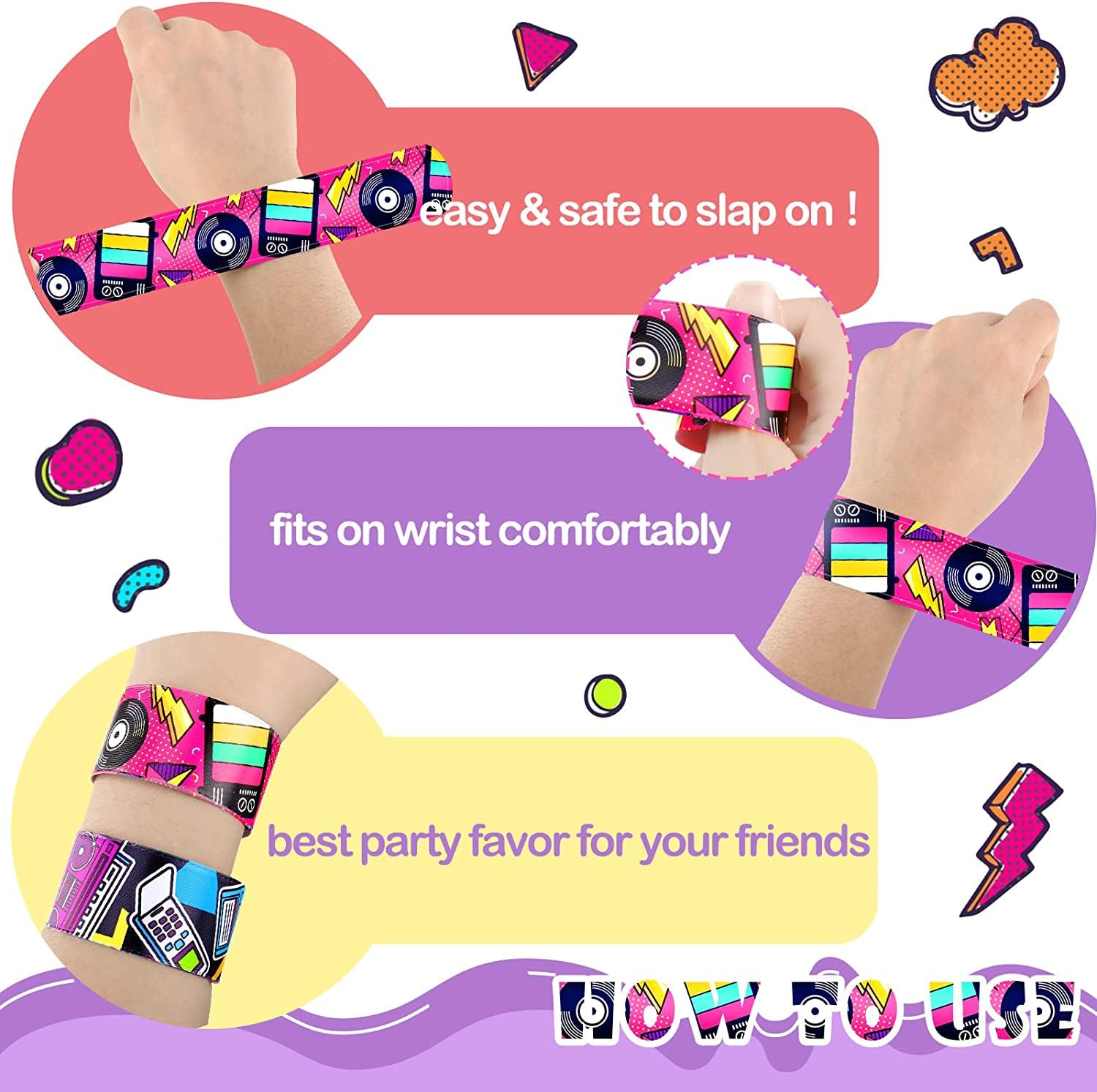 Package includes: You will get 48 pcs 80s 90s theme slap bracelets in different colors, with 12 different style designs. | Child Safe: Non-Toxic. Meet US toy standard. Safety test approved. | Easy to Wear: You just need to tap it gently on your wrist, and it will form a circle and wear it firmly on your wrist. | Retro Theme Party Favors: Perfect for 80s 90s throwback theme, concert, Birthday Gifts, concert, Christmas Gifts, Children's Day Novelty Gifts, Rewards, Party Gifts and so on. | Ideal Gift: A perfect choice for school parties, classroom treasure box, treat bags, birthday party, school prizes, prizes for class, birthday party, school prizes and carnival party favors. Put them in goodie/goody bags for valentine's day, school Festivals! Keep it stylish, your kids will surely have fun!
