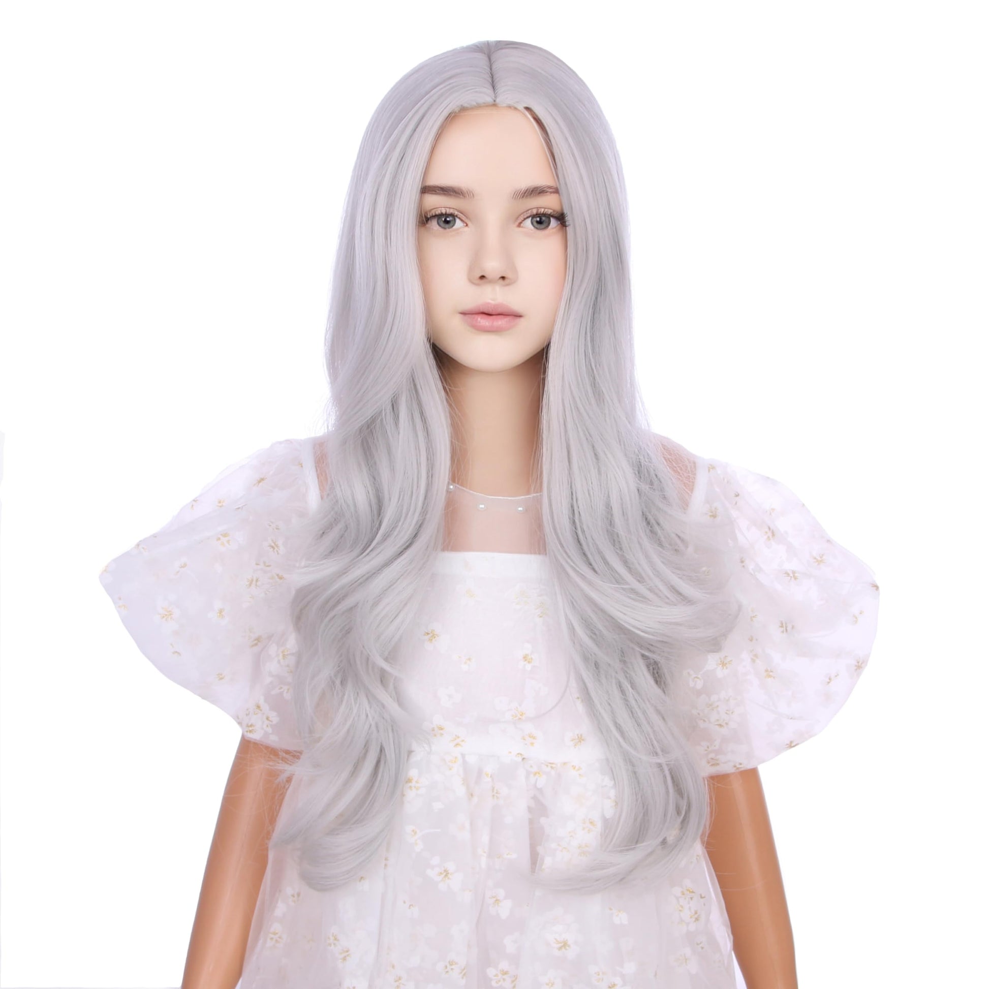 Duduwig Girls Silver Gray Wig Child Long Silver Grey Middle Part Wig Kids Long Silver Gray Wavy Curly Wig Heat Resistant Synthet