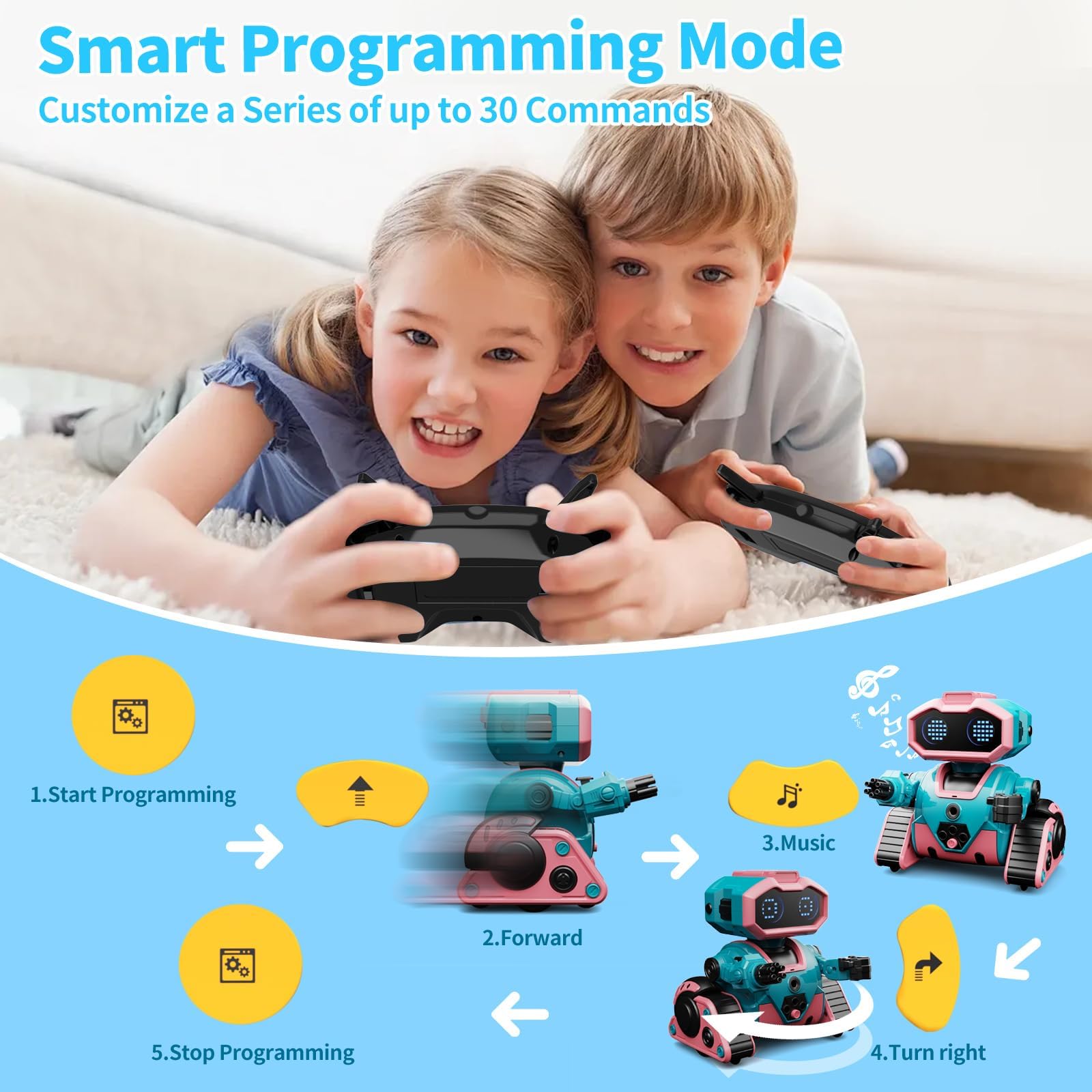 - Q: What types of actions can the robot perform through programming? A: The robot can demonstrate a set of 30 user-inputted actions, allowing kids to create sequences of movements such as turning left, turning right, walking forward, and walking backward.