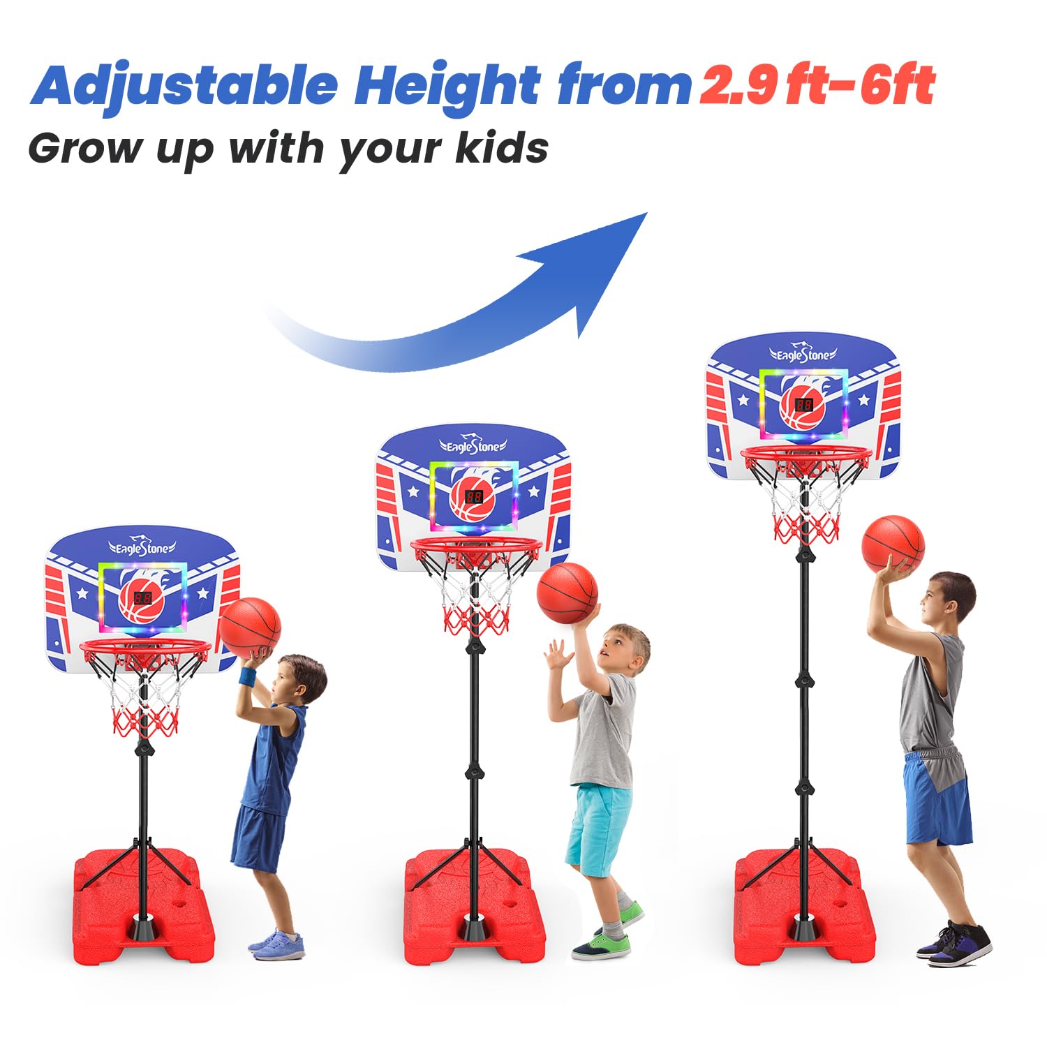 Eaglestone Kid Basketball Hoop Indoor With Led Lights & Scoreboard,Toddler Basketball Hoop Adjustable Height 2.9Ft-6Ft, Mini Hoop Outdoor With 3 Balls,Basketball Toy Gifts For 3-12 Year Old Boys Girls