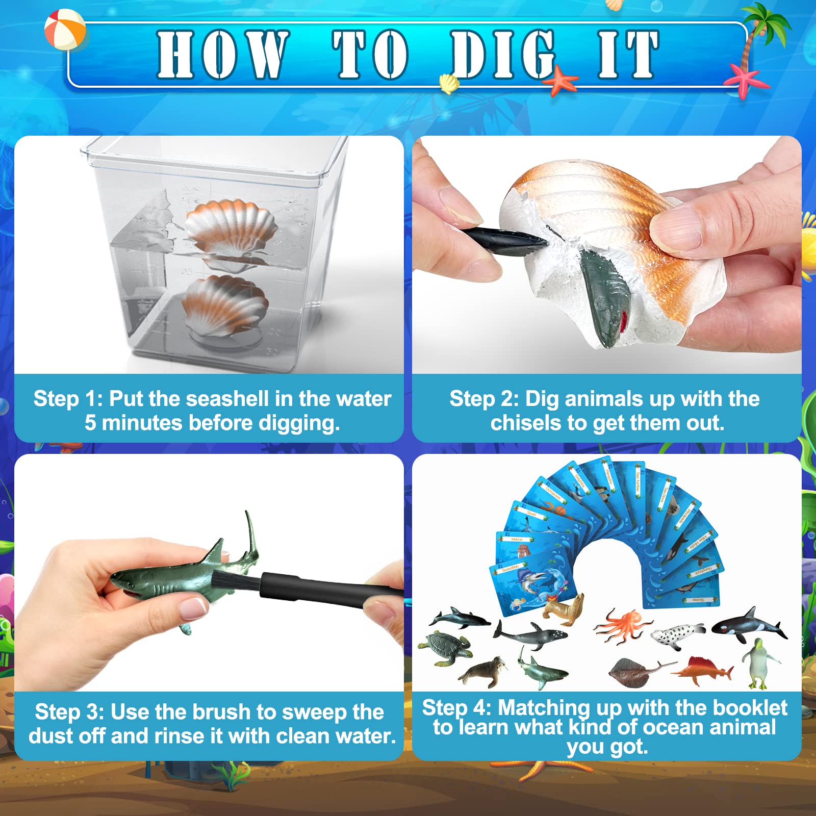 - Q: What materials are included in the Ocean Animals Dig Kit? A: The kit includes 12 surprise ocean animal toys, 12 chisels, 12 brushes, and a beautifully illustrated instruction guide to enhance the learning experience.