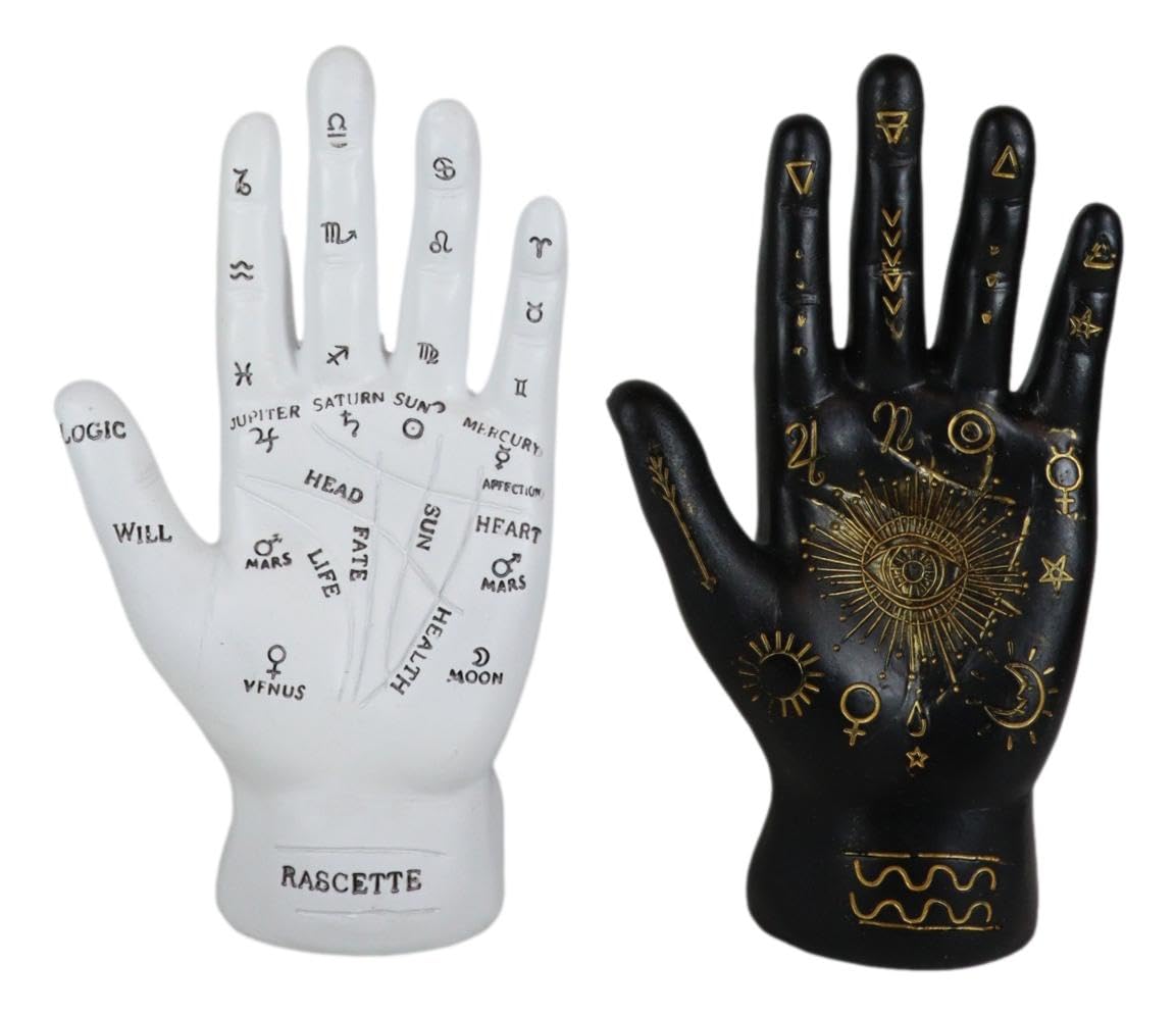 - Q: What are the different color finishes available for this figurine? A: The Palmistry Hand figurine is available in two color finishes: black and white. Each finish features different sets of symbols and words, making it ideal for collectors.