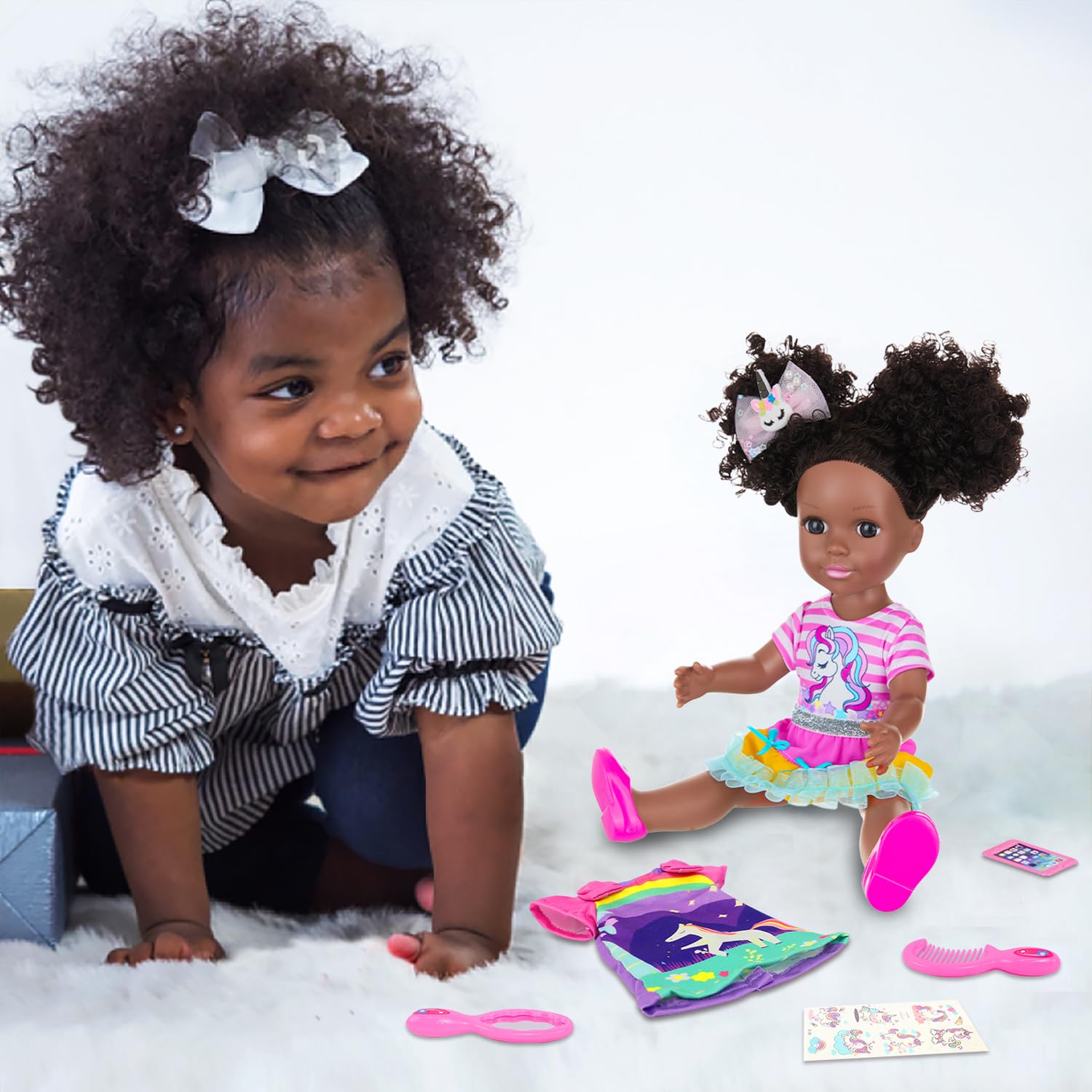 Ecore Fun 14 Inch Black Doll with Black Baby Doll Clothes Accessories - Including Dress Top Skirt Shoes Comb Mirror Hairclip Phone & Stickers - African Realistic Silicone Girl Dolls for Girls