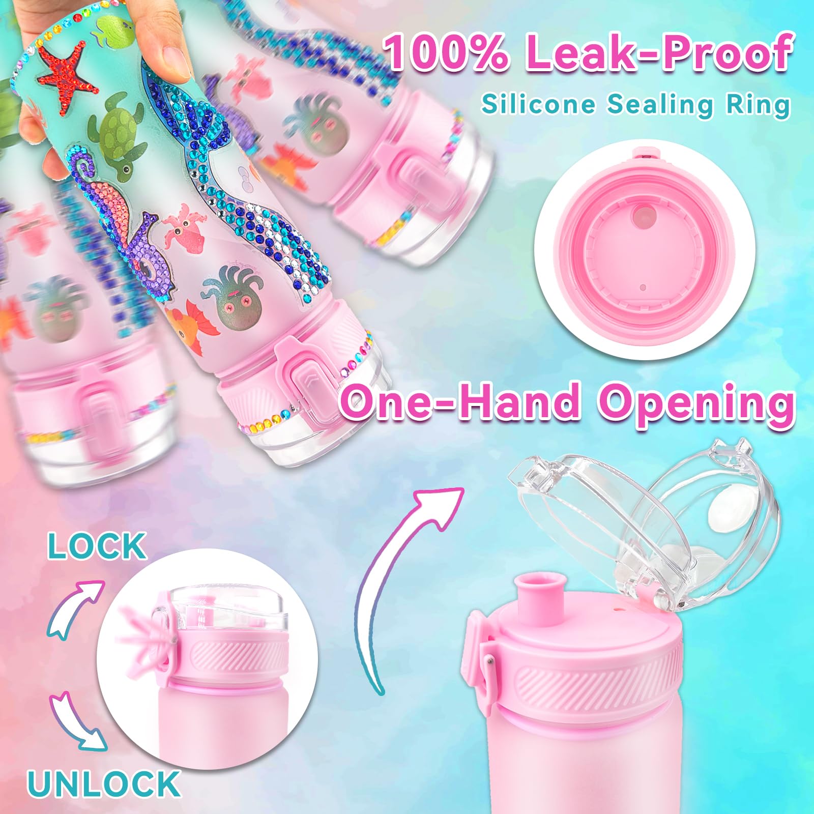 PACKAGE INCLUDE: 600mL Water Bottle x1, Mermaid Pattern Sticker x1, Gemstone Sticker x1, Cartoon Stickers x2, Inspirational Sticker x1, Multi-Color Diamond Bag x1, Diamond Pen x1, Plastic Tray x1, Jelly Glue x1, Mini Key chain x1.