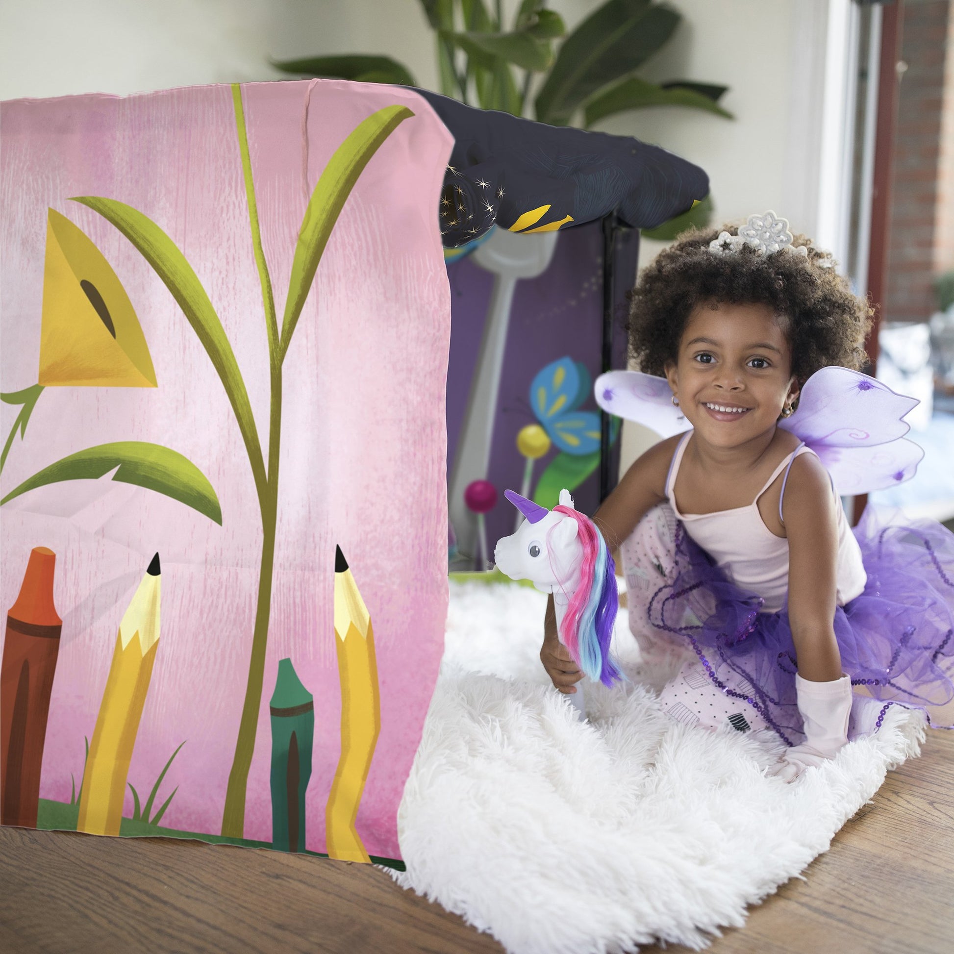 Make a space to call your own with fantastic forts fairy tale, the under-the-table fabric fort! Drape The fairy tale–themed fort base over any table or set of chairs to create a secret space underneath, Perfect for pretend play, reading, and more. Cloth ties open and cinch each wall. Purchase additional fantastic forts and layer them to create a bigger fort on a larger table. Pretend play develops creativity and imagination, Encourages independence, boosts self-confidence, and more. Fantastic!