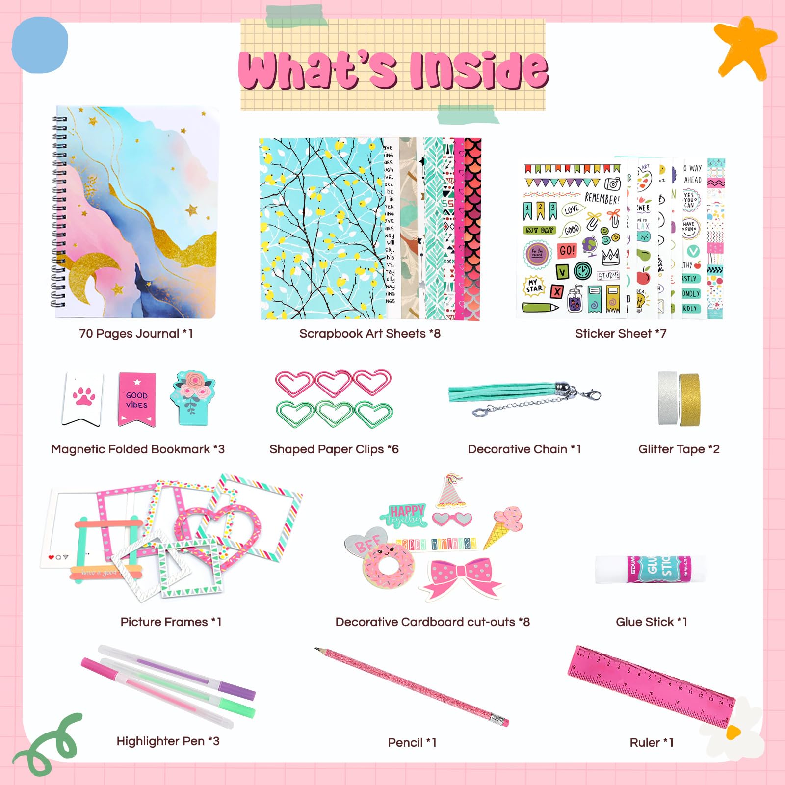 - Q: What types of supplies are included in the journal kit? A: The kit contains over 70 pieces, including a 70-sheet journal, decorative cardboard cut-outs, picture frames, glitter tapes, shaped paper clips, magnetic bookmarks, scrapbook art sheets, sticker sheets, a pencil, glue stick, decorative charm, markers, a ruler, and a detailed instructions guide.