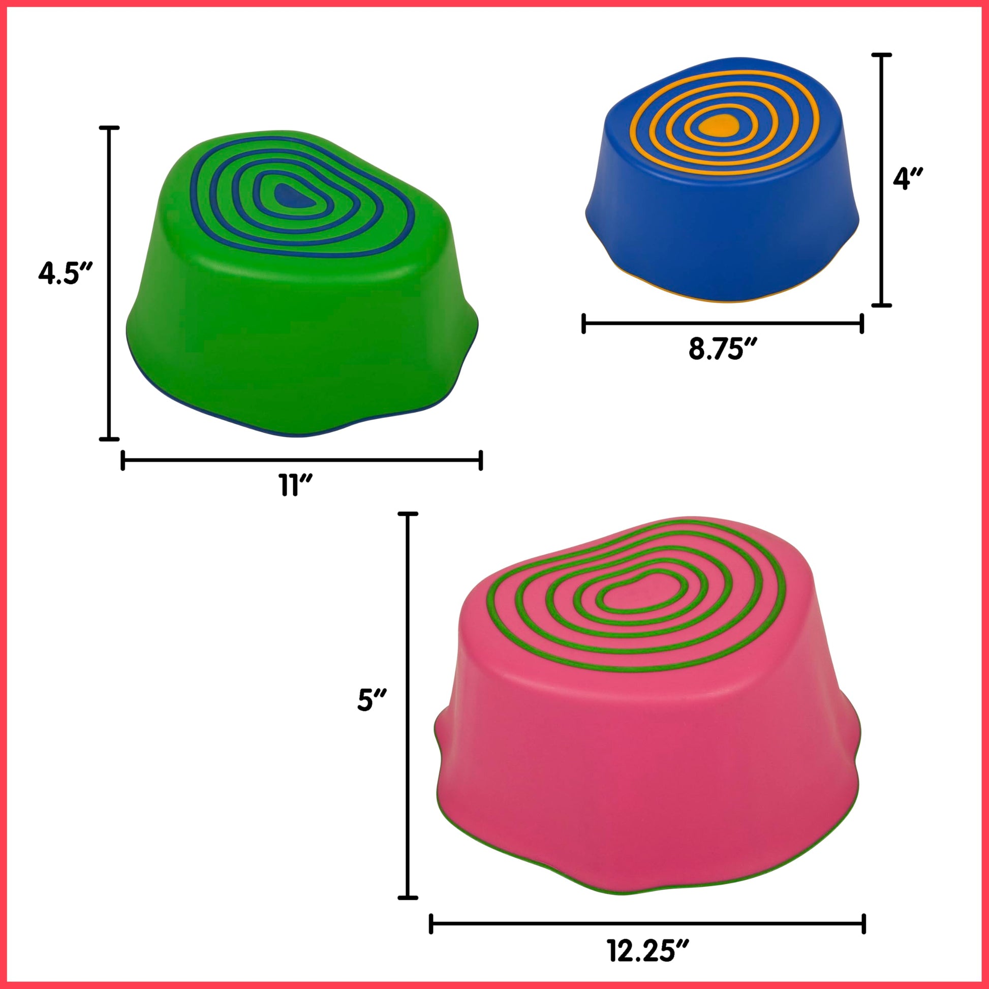 Step into fun with these three colorful stumps! Inspire children to build balance and coordination as they explore their own active adventure! Each stump features a grippy rubber top and base to prevent slipping. Made of durable plastic, this play equipment is designed to last for years of indoor or outdoor use. Add them to playrooms and montessori spaces. Or, use them for sensory exploration. Take these lightweight, stackable stumps anywhere you go! For ages 18m+. || Size of blue stump: 8.75 W x 4 H. Size of green stump: 11 W x 4.5 H. Size of pink stump: 12.25 W x 5 H.