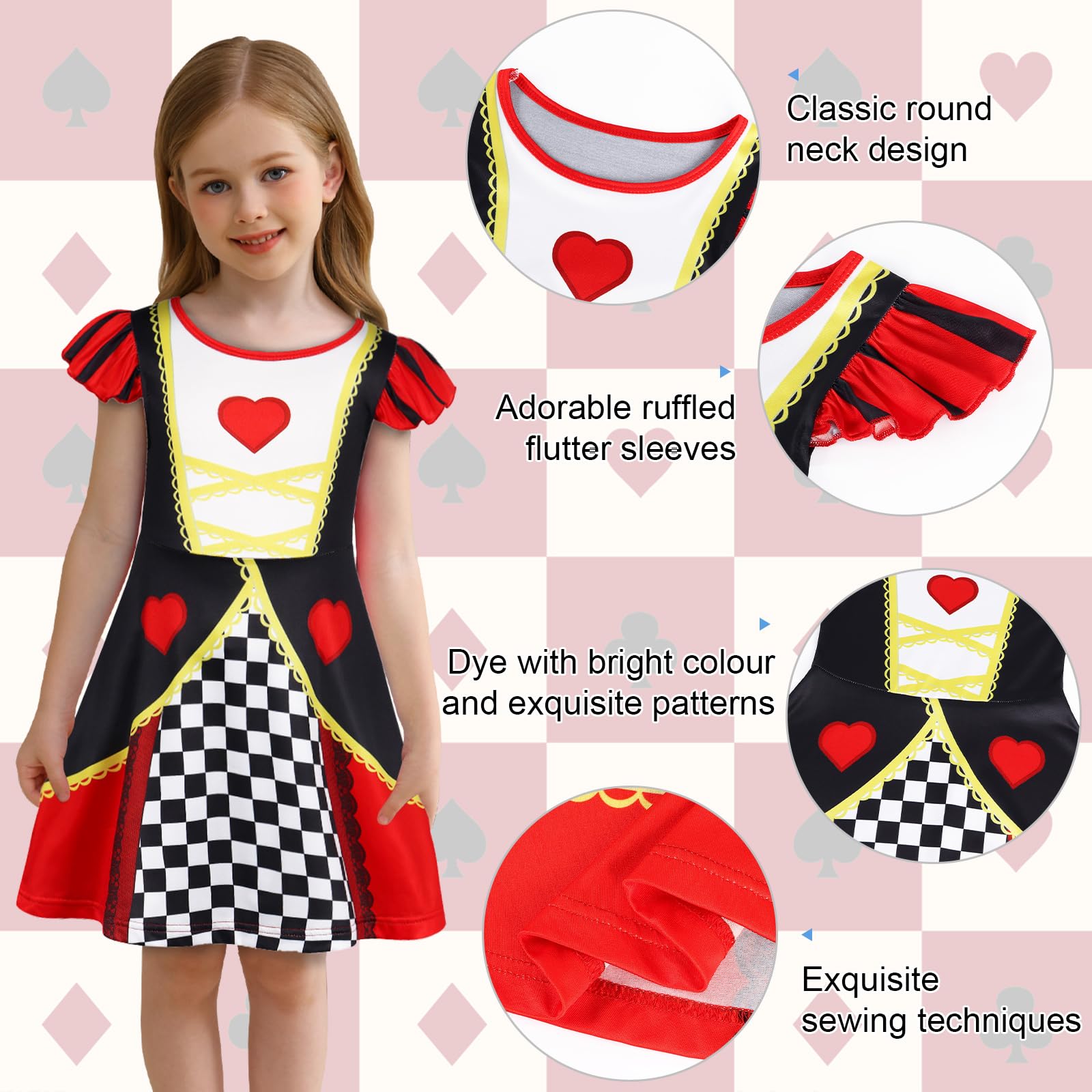 Girl's summer casual flutter sleeve dress is made of soft, skin-friendly and breathable fabric, not allergies, cute princess The Queen Of Hearts dress will make her feel very happy. | Girls summer dress is designed to knees length, round collar, flutter sleevele, funny cartoon printed, simple pullover style, every girl will enjoy this flutter sleeve swing dresses and receive many compliments. | The Queen Of Hearts dress is the best choice for your little sweetheart. She will definitely be very happy to receive this cute swing sundress. girls dress, The Queen Of Hearts dress, princess The Queen Of Hearts dress, The Queen Of Hearts costume, summer dress, tiered dresses, school dress, casual dress, midi dress. | Suit for casual, daily wear, school, beach, vacation, birthday, party, festival, photo shoot, banquet, hawaiian, role-playing, school, carnival, holiday, picnic, and other special occasions, perfect gift for girls casual dresses. | 7 sizes for choose, suitable for 1-10 years old girls. Please check the size chart carefully before placing your order. There may be an error of 1-3 cm. this is normal phenomenon. Please understand that, please confirm before placing an order.