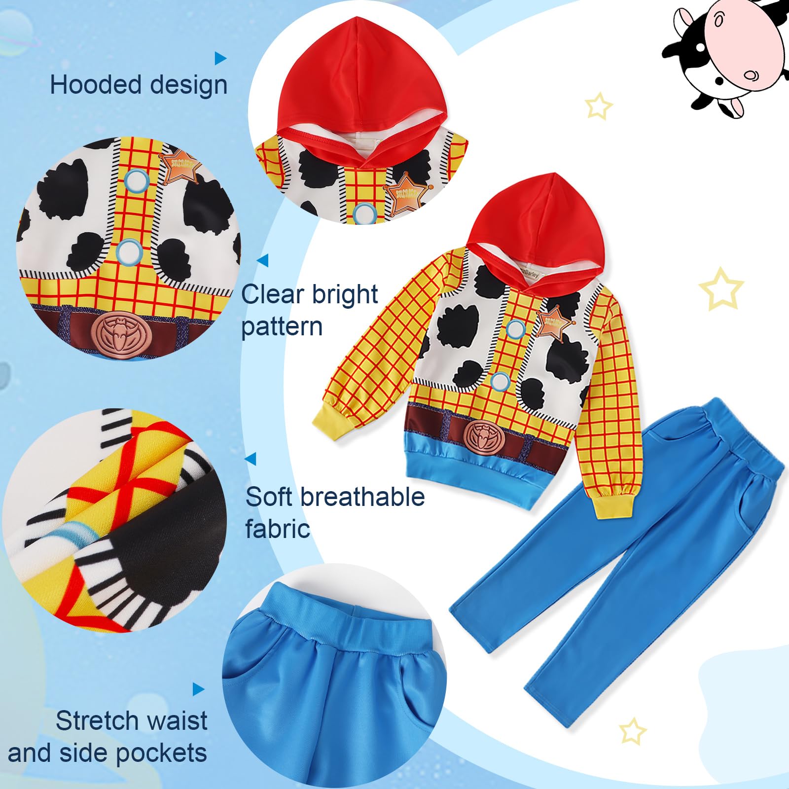 2PCS Woody costume for boys casual hoodie sweatshirt and long pants fantastic cartoon toy cosplay dress up sweatshirt suitable for autumn winter spring. | This boy's woody long sleeve costume hoodie pants set is made from a premium soft and comfortable cotton blend fabric. Take your kids on a wonderful story tour. | This hoodie is digitally printed with cartoon graphics clearly visible. The pullover and elastic waist pants are designed to make it a breeze for the kids to wear. Boys' woody costume long sleeve sweatshirt and trousers clothes set is the best gift for your little boy. | Perfect for everyday, Christmas, Halloween, shopping, vacation, role-playing games, outdoor activities, running sports, birthday gifts. Boys woody costume set fun all-round clothes that your child can wear anywhere and experience the fun of Sheriff Woody. | Package: 1* Hooded Sweatshirt, 1* Pants. This outfit is suitable for boys and girls. Suitable for children aged 3-10. Our size is different from Amazon, please check the size chart in the product picture.